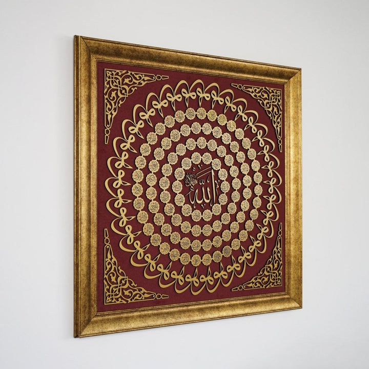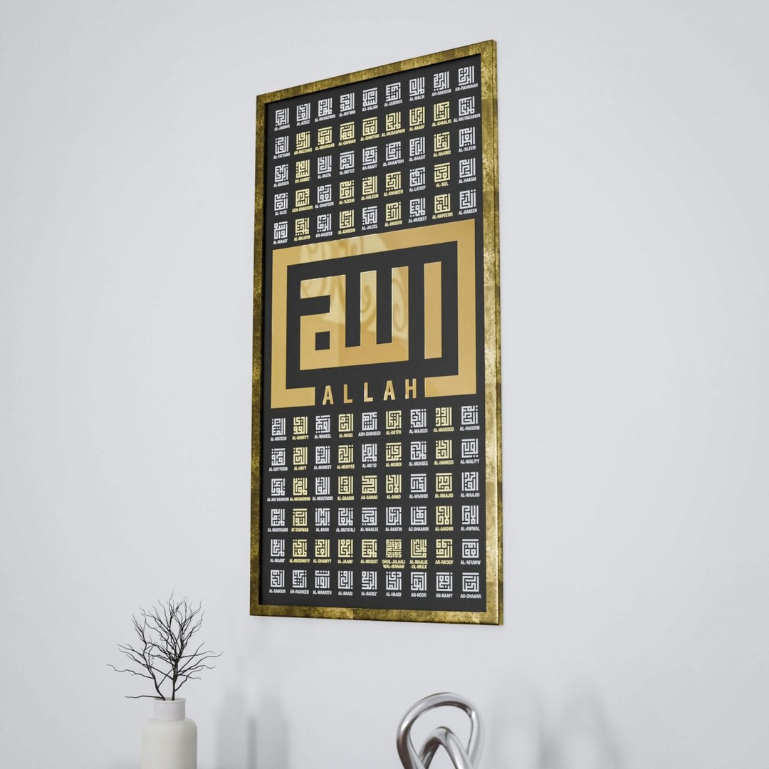 تعتبر لوحة أسماء الله الحسنى هذه طريقة جميلة لإضفاء معنى على منزلك. تم نحت كل اسم من أسماء الله الحسنى بدقة بواسطة الليزر على الخشب، وتم وضعه بعناية على خلفية من المخمل الناعم، مما يضفي ملمسًا غنيًا وعمقًا على القطعة. مُحاطة بإطار مطلي يدويًا بتذهيب ذهبي، تشع بريقًا دافئًا ومرحِّبًا، لتجمع بين الفن والتقليد بأسلوب فريد يجمع بين الأصالة والعاطفة في أي مساحة. اكتشف المزيد من فنون الخط الإسلامي المؤطرة!