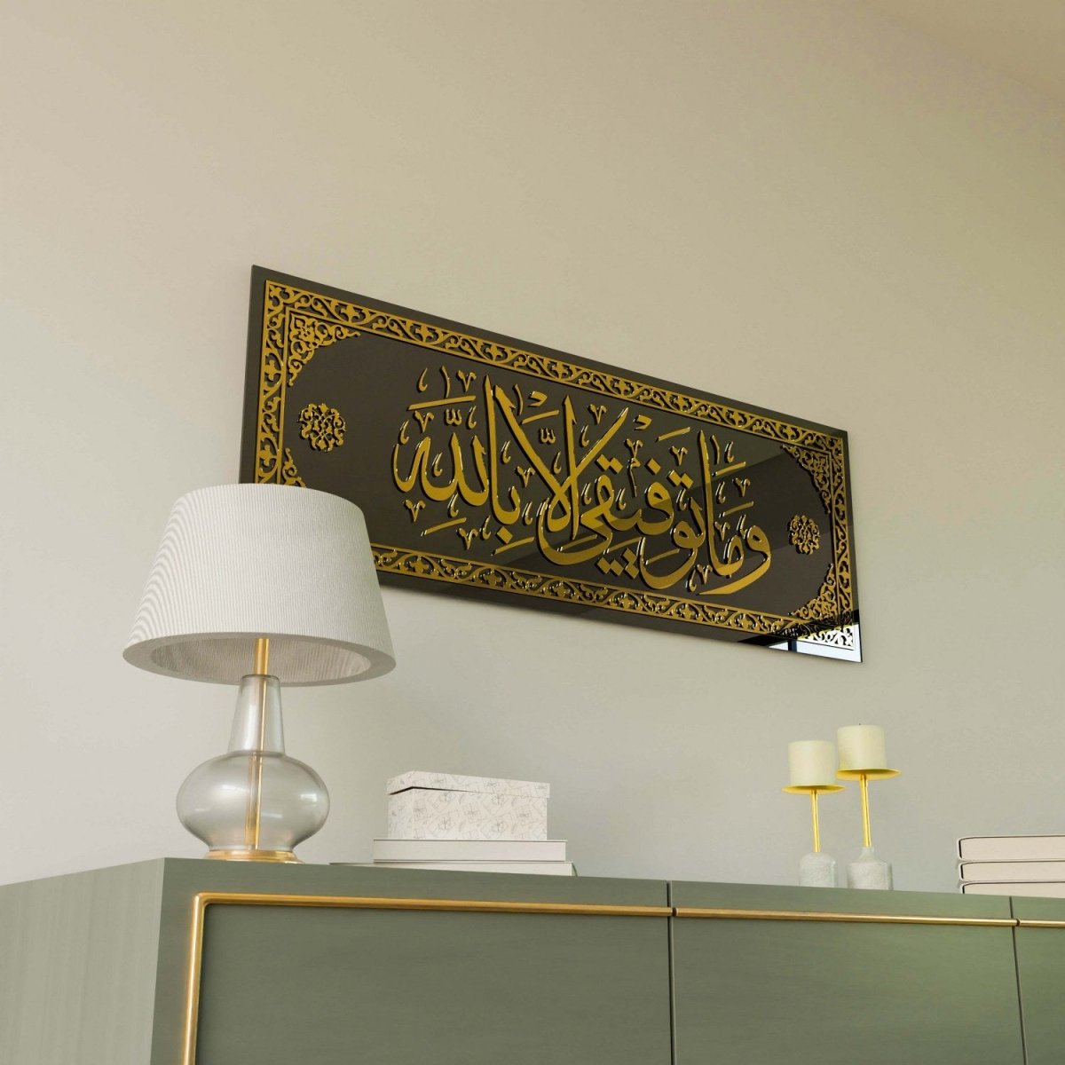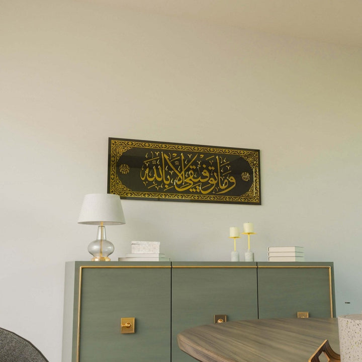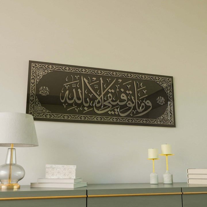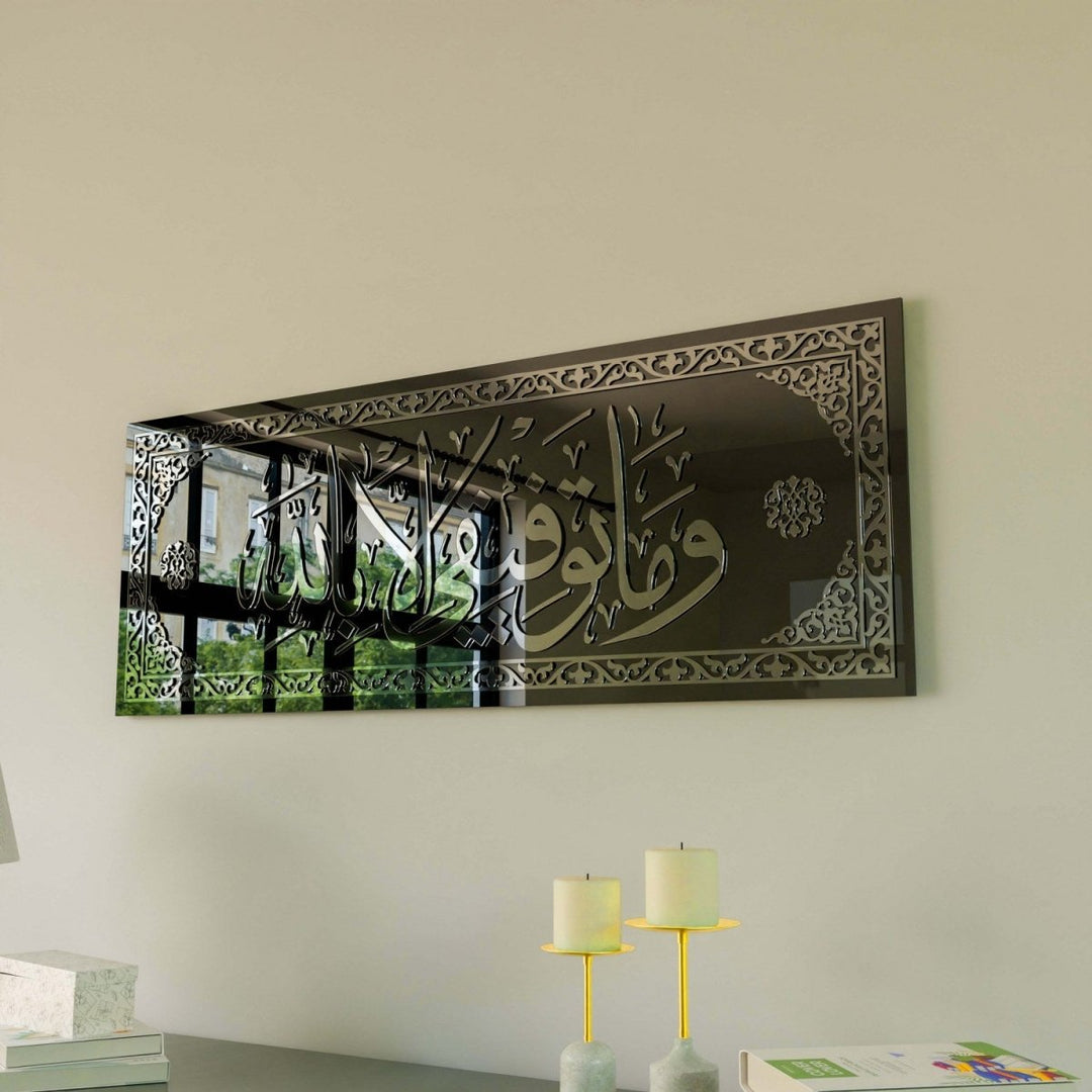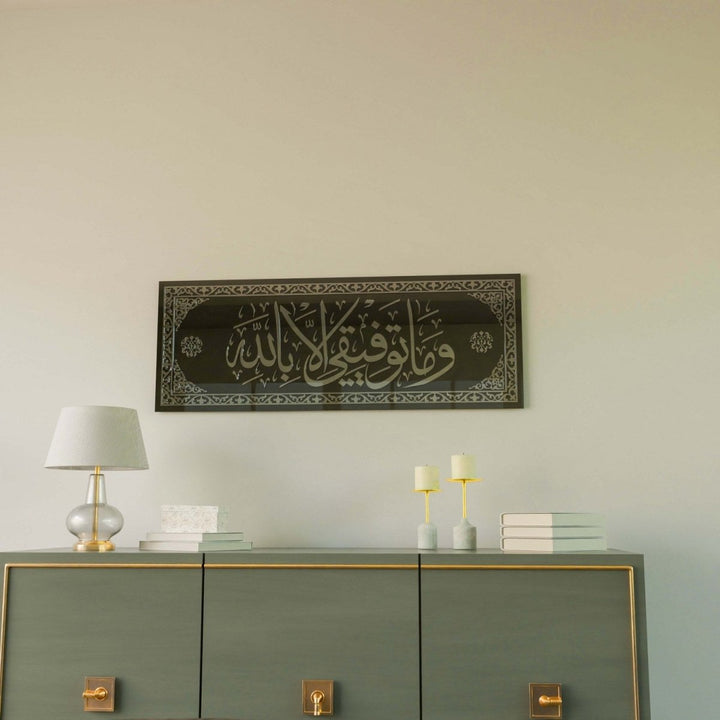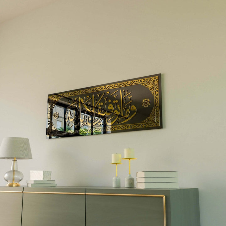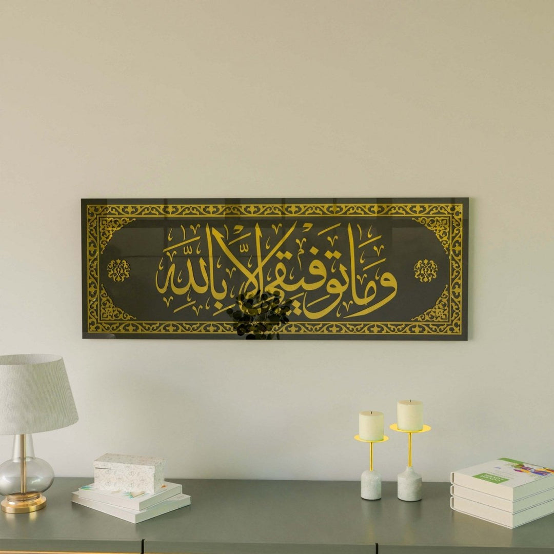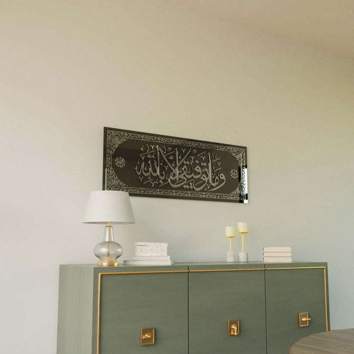 امزج منزلك بجوهر الإلهام من دعاء النجاح من سورة هود، الآية 88، المصور بأناقة في ديكور الجدار الإسلامي على الزجاج المقوى.