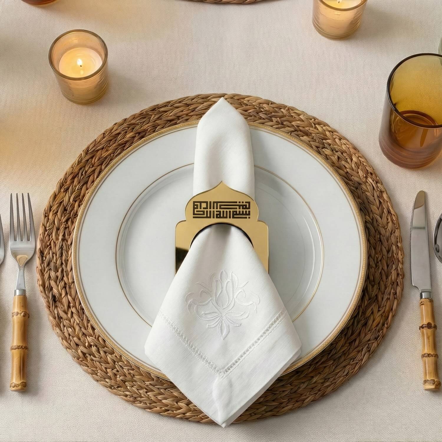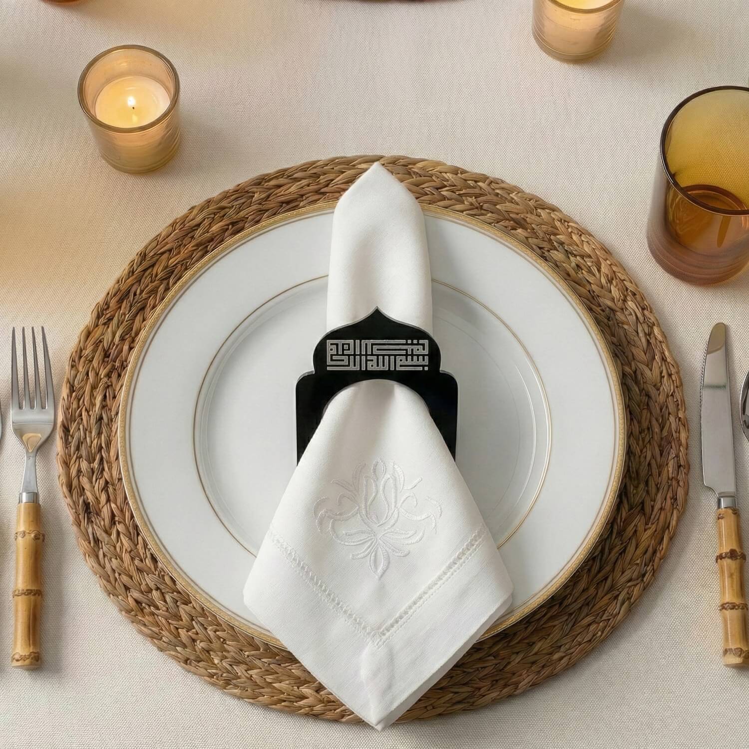 Update your **iftar table** with the sharp, architectural beauty of our **Basmala Kufic Dome Acrylic Napkin Rings**. This design features the **Basmala** *"Bismillah al-Rahman al-Rahim"* (In the name of Allah, the Most Gracious, the Most Merciful) rendered in the bold, linear **Kufic script**.