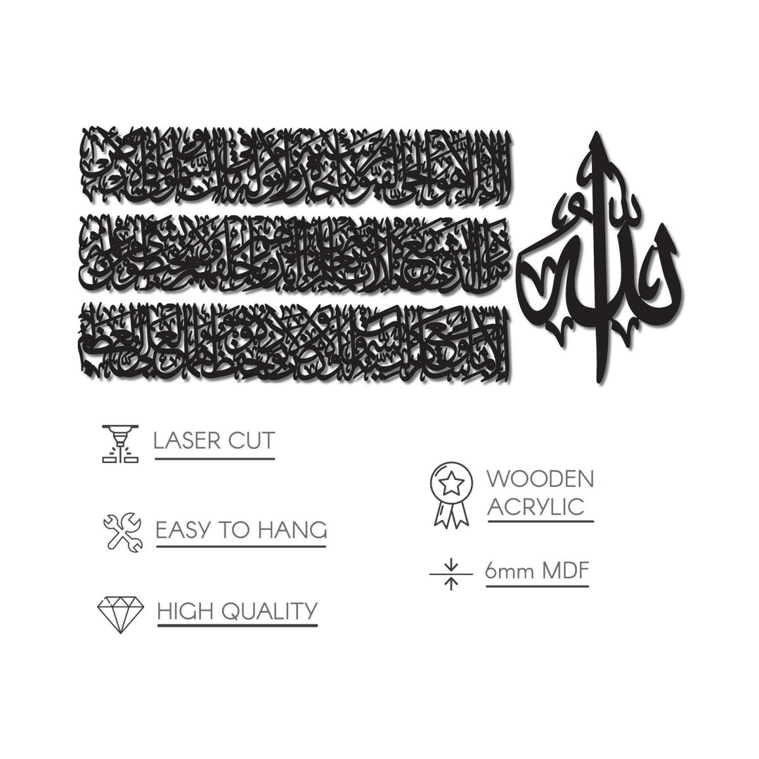 أضف إشراقة إلى منزلك مع فن الخط العربي لآية الكرسي على الحائط. هذه المجموعة المكونة من 4 قطع من الخط العربي لآية الكرسي والمصنوعة من الخشب والأكريليك، هي مزيج رائع من الفن الإسلامي والجماليات الحديثة. يُعد هذا الفن الفريد من نوعه لآية الكرسي أيضًا ديكورًا مثاليًا لرمضان لجدرانك. مناسب كهدية للمسلمين، فهو يثري الجو الروحاني لشهر رمضان وعيد مبارك، ويمزج بين العمق الروحاني والتصميم المعاصر لخلق أجواء هادئة ودافئة. اكتشف ديكورات حائط إسلامية أخرى من الأكريليك والخشب بالضغط هنا!