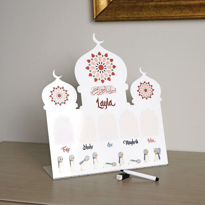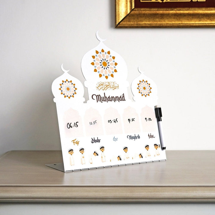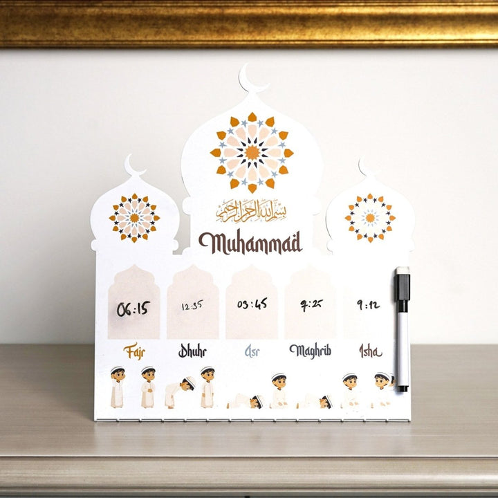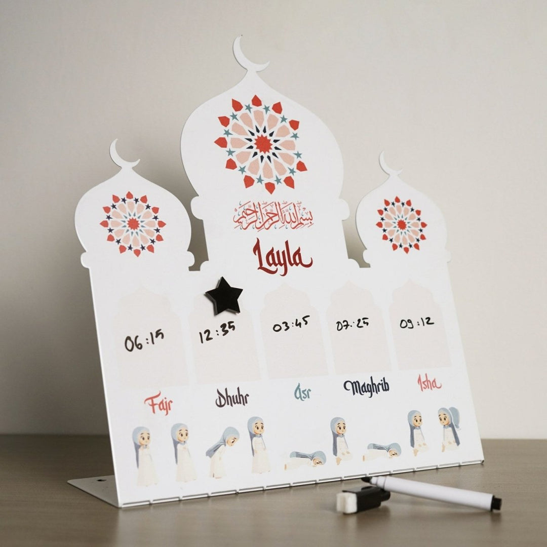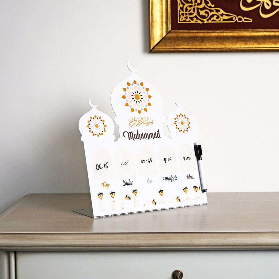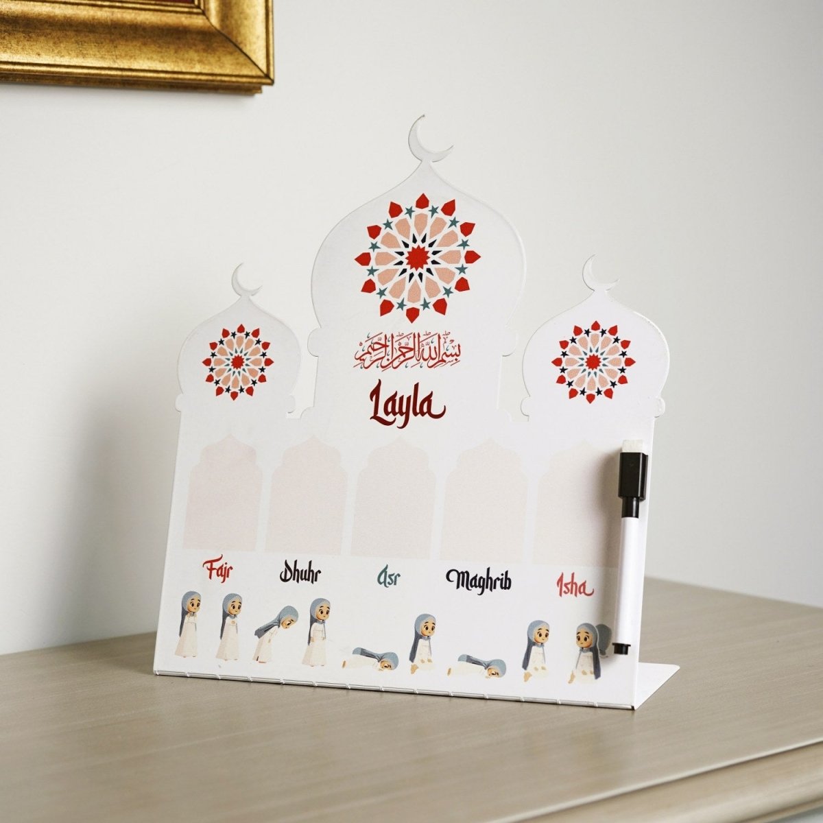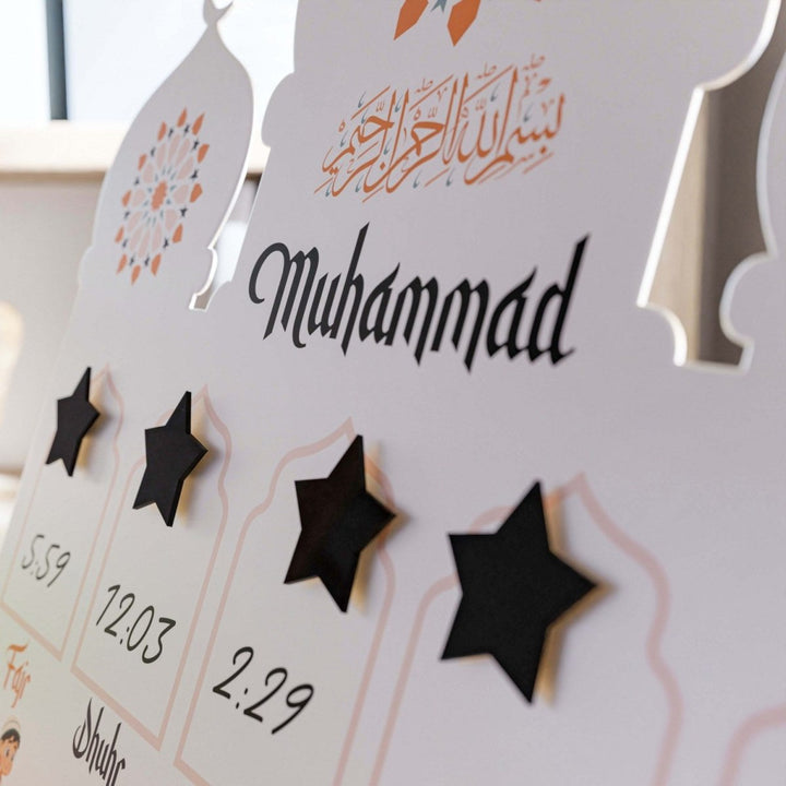 مصمم كجدول أوقات الصلاة للأطفال، يتميز هذا الديكور المستوحى من تصميم المسجد بإلهام الصغار لتتبع أوقات الصلاة والانخراط في أنشطة رمضانية مفيدة للأطفال. تضيف عبارة "بسم الله" في الأعلى، مع اسم الطفل المخصص أدناه، لمسة شخصية تجعلها هدية رمضانية مميزة للأطفال.