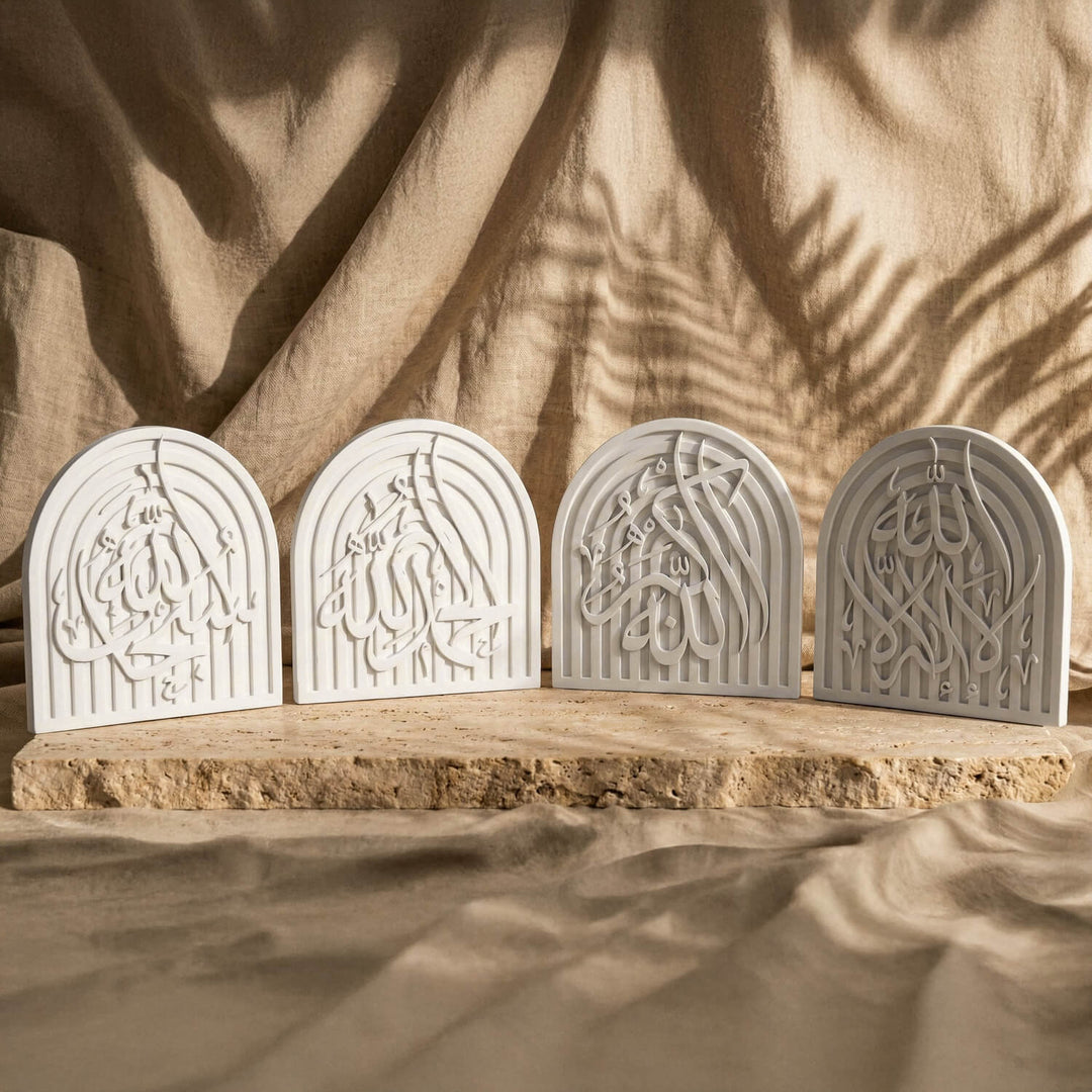 Each decor piece is inspired by beloved Islamic themes including Allah (SWT), Prophet Muhammad (PBUH), Asma Ul Husna, Basmala, dhikr expressions like Subhanallah and Alhamdulillah, and holy mosques such as Masjid Al-Haram, Masjid An-Nabawi, and Masjid Al-Aqsa. With Kufic calligraphy, dua for iftar, and Quranic verses, each product is a unique combination of faith and elegance, ideal for personal use or as a meaningful gift.