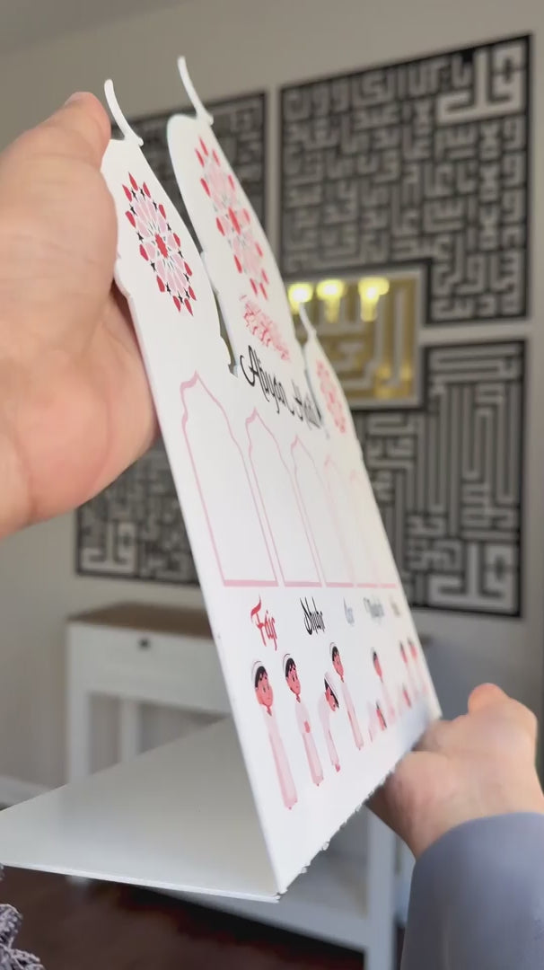 Encourage your children to embrace their daily prayers with this unique Salah Schedule for Kids Islamic Table Decor. Designed as a prayer times table decor for kids, this Mosque designed piece inspires young ones to track their salah times and engage in meaningful Ramadan activities for kids. The Bismillah inscription at the top, along with the child's personalized name below, makes it a heartfelt ramadan gift for a child. Featuring depictions of children in prayer postures like qiyam, ruku, and sujood, it’s a thoughtful tool to teach and inspire during the sacred month.