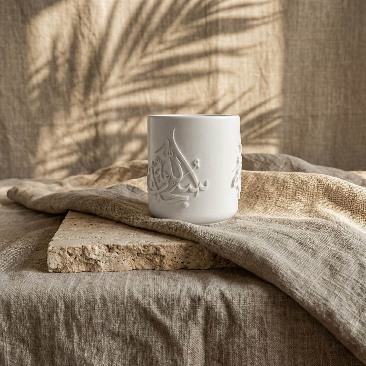 This handmade stone incense burner (Mabkhara) is a masterpiece of spiritual art. Unlike geometric designs, this piece features the fluid, rhythmic beauty of Thuluth calligraphy—one of the most elegant and prestigious forms of Arabic script. The cylindrical vessel is deeply carved with the powerful Tasbih phrases: "Subhanallah" (Glory be to Allah), "Alhamdulillah" (Praise be to Allah), and "Allahu Akbar" (Allah is the Greatest).