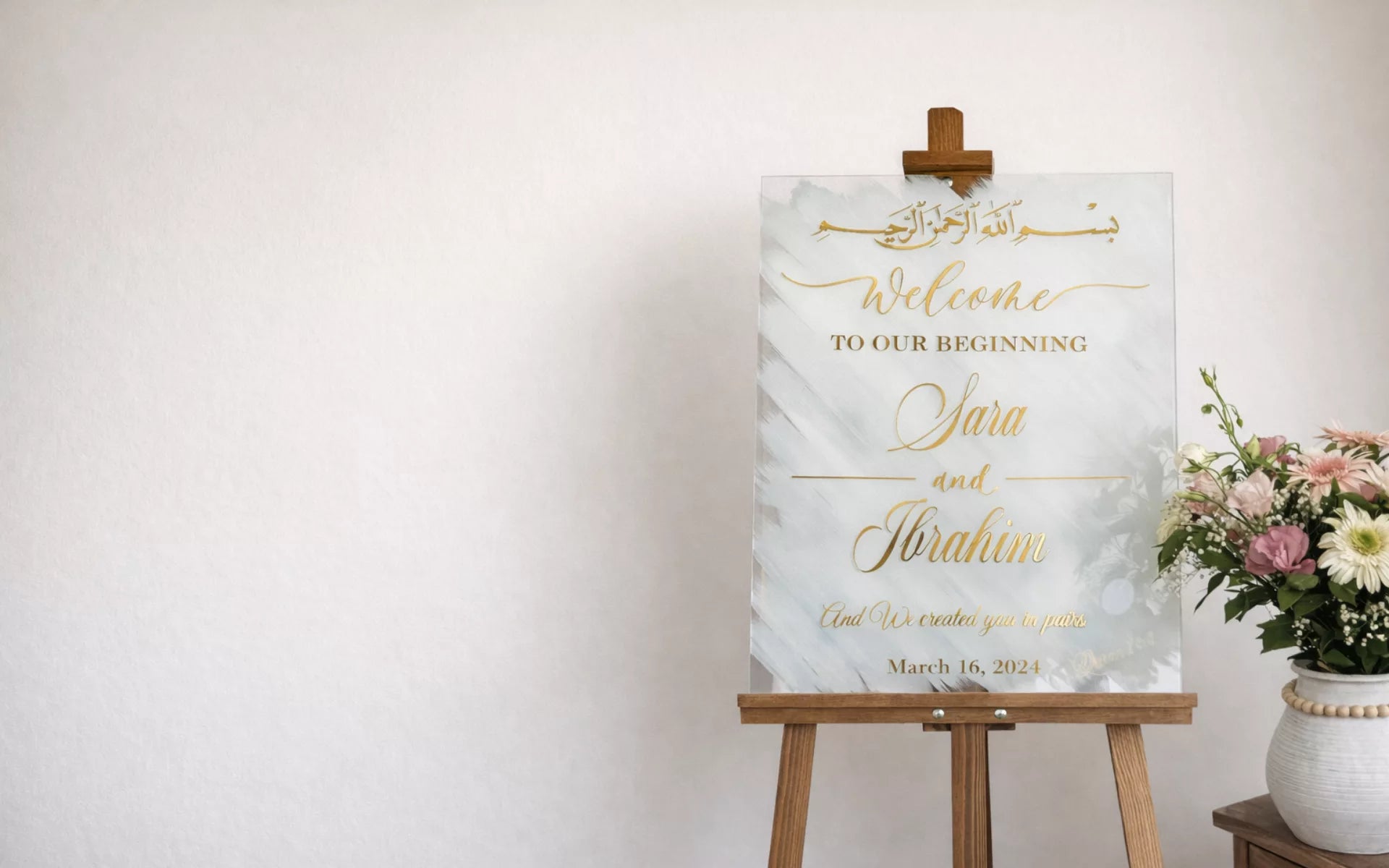 The latest trend focuses on minimalist but premium materials. Using tempered glass with gold or white calligraphy of sacred verses is currently one of the most popular choices for a modern nikkah welcome sign.