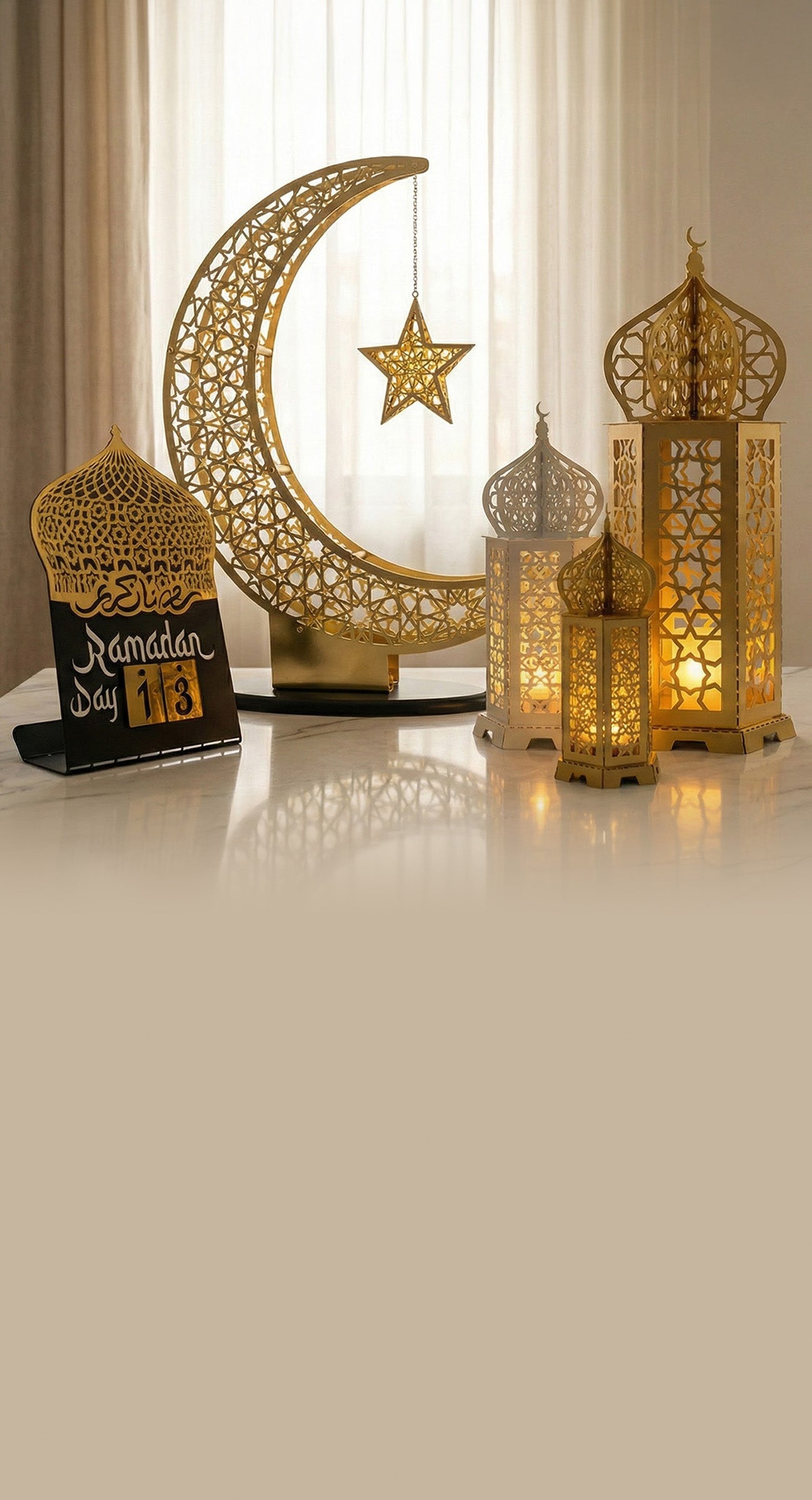 The crescent moon marks the beginning of the Islamic lunar month, including Ramadan. Lanterns symbolize guidance, warmth and faith, making them traditional Ramadan icons.