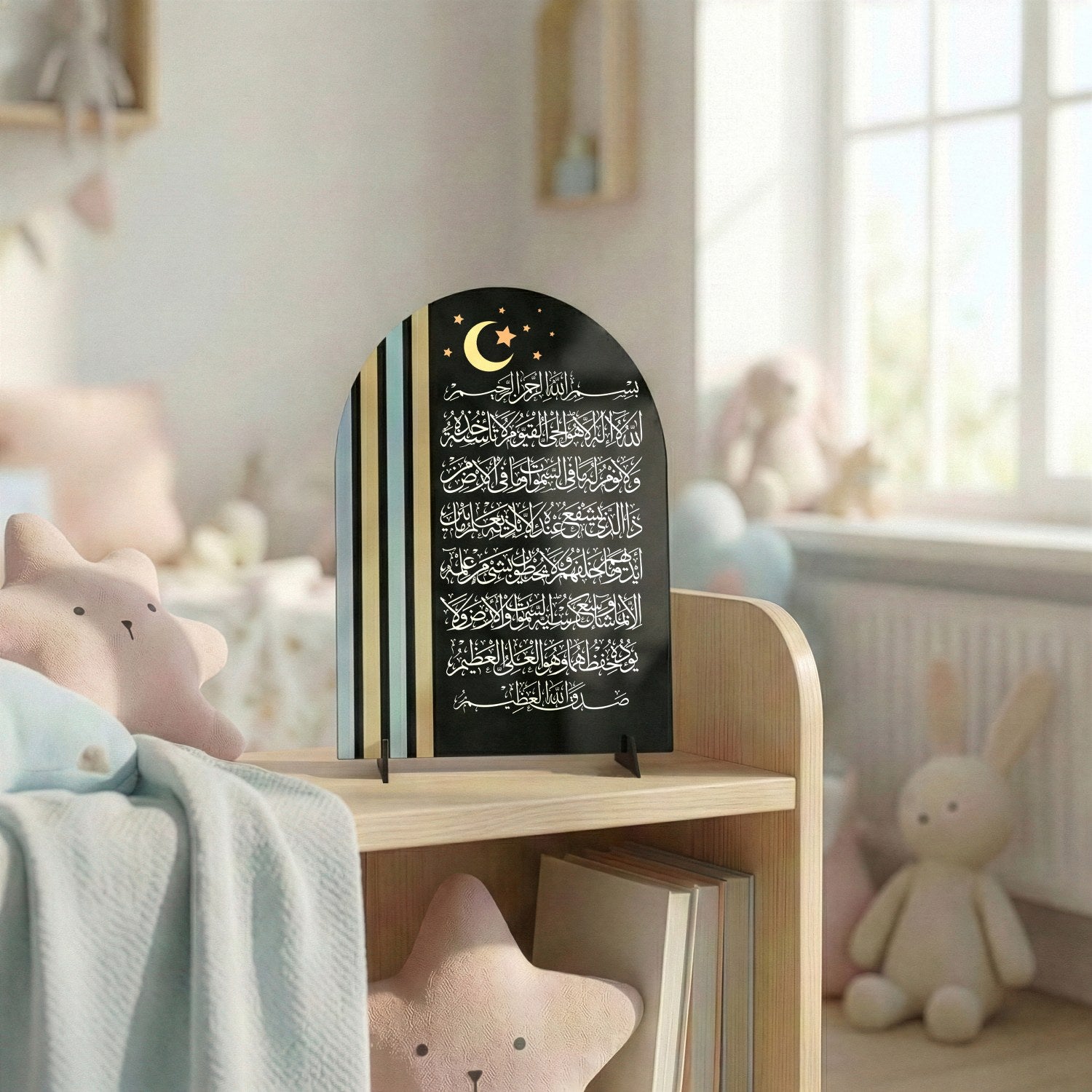Create a serene and blessed environment in your child’s room with this beautiful **Ayatul Kursi Tabletop Decor**. Designed specifically to stand on a nursery dresser, bookshelf, or bedside table, this piece features the powerful "Verse of the Throne" in a gentle, kid-friendly aesthetic. It serves as a constant spiritual reminder and a symbol of protection while your little one sleeps.