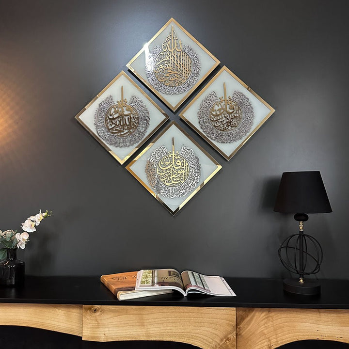 Werten Sie Ihren Raum mit der spirituellen Essenz unseres Sets aus Ayatul Kursi, Surah Al Ikhlas, Al Falaq und islamischer Wandkunst aus gehärtetem Glas von An Nas auf.