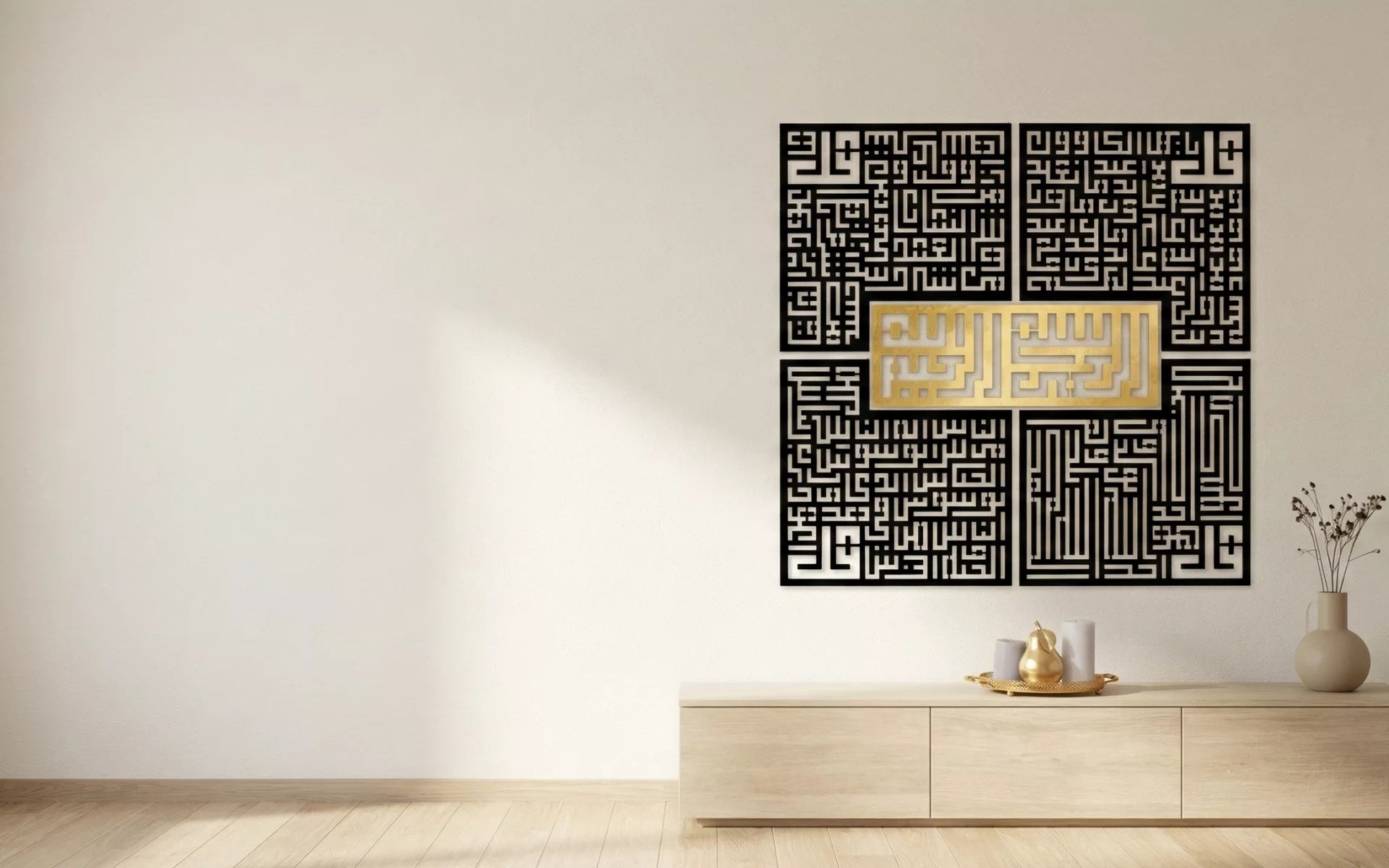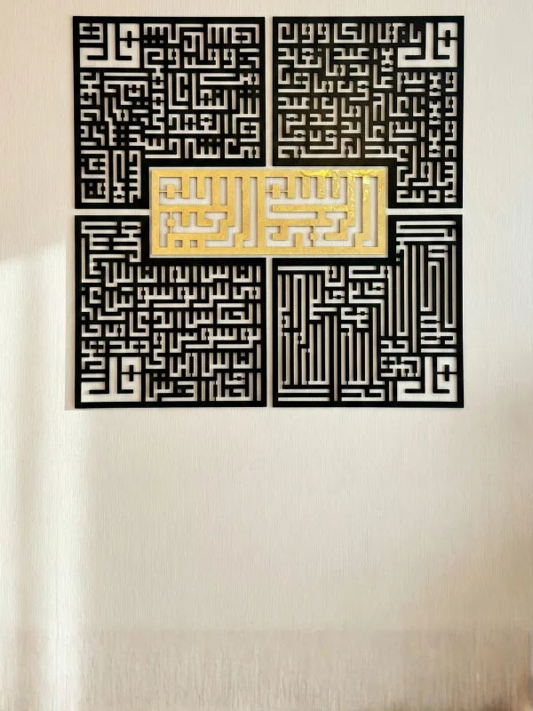 Die Kollektion „4 Qul“ vereint die heiligen Verse von Al-Kafirun, Al-Ikhlas, Al-Falaq und An-Nas. Die Designs dienen als spirituelle Erinnerung im Wohn- und Arbeitsumfeld. Die Kollektion umfasst verschiedene Stile arabischer Kalligrafie und verbindet traditionelle Schriften mit modernen Designelementen, um ein breites Spektrum an Einrichtungsstilen zu bedienen.