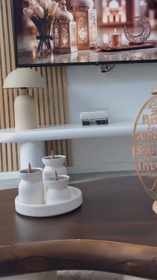Diese exquisite Kollektion umfasst unsere handgefertigten Räuchergefäße aus Stein (Mabkharas) in drei verschiedenen Höhen, die als harmonisches, gestaffeltes Set arrangiert werden können. Frei von jeglichem Schmuck bestechen diese Stücke durch ihre klare Form und die natürliche Schönheit des Materials. Die klaren, geometrischen Linien erzeugen eine moderne, an eine Skyline erinnernde Silhouette, die jedem Raum Ruhe und Ordnung verleiht.