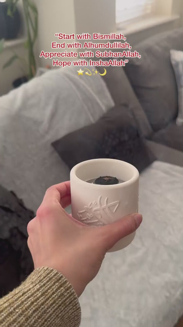 Dieser handgefertigte Räuchergefäß aus Stein (Mabkhara) ist ein Meisterwerk spiritueller Kunst. Im Gegensatz zu geometrischen Mustern besticht dieses Stück durch die fließende, rhythmische Schönheit der Thuluth-Kalligrafie – einer der elegantesten und angesehensten Formen der arabischen Schrift. Das zylindrische Gefäß ist tief mit den kraftvollen Tasbih-Sätzen „Subhanallah“ (Gepriesen sei Allah), „Alhamdulillah“ (Lob sei Allah) und „Allahu Akbar“ (Allah ist der Größte) verziert.
