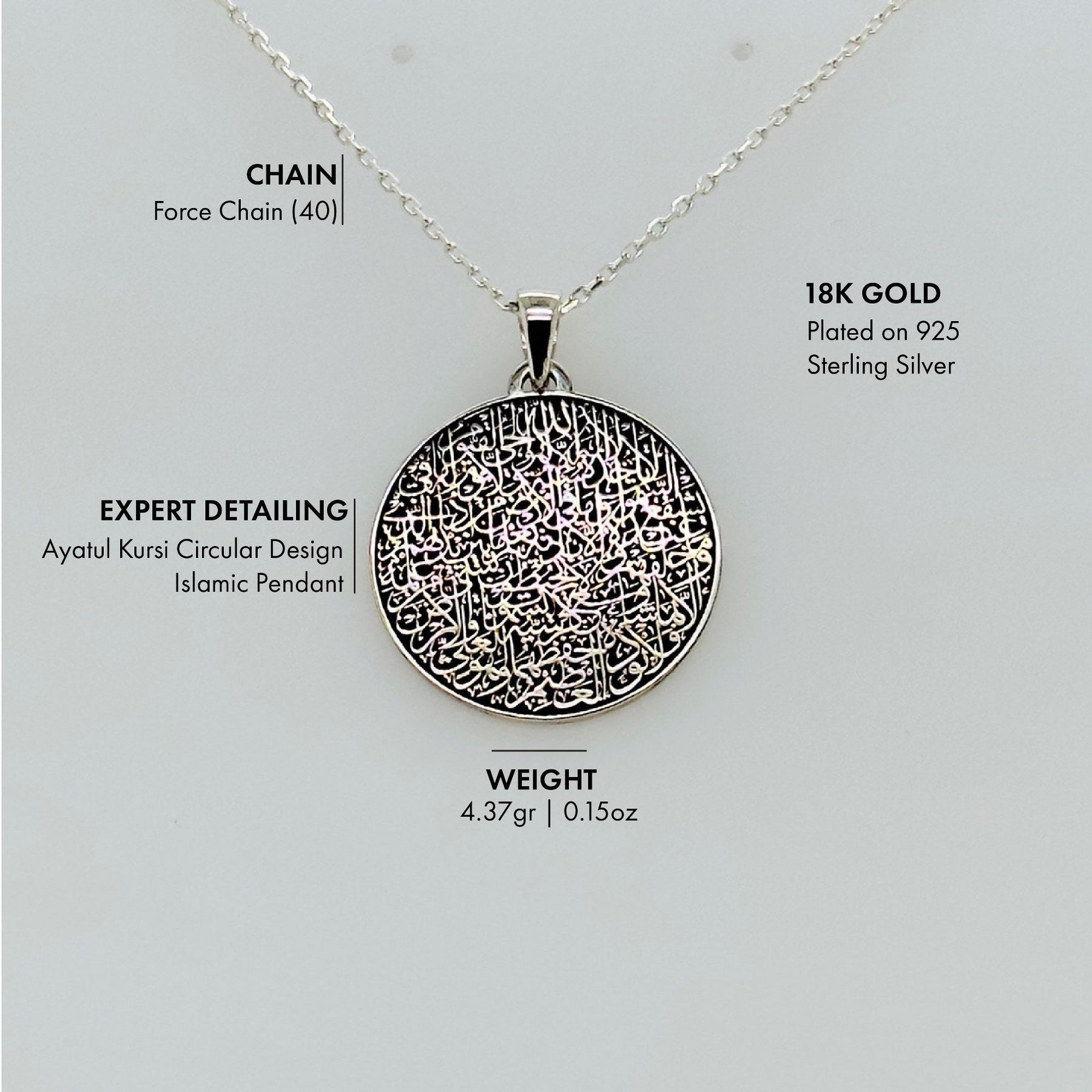 Hüllen Sie sich in die spirituelle Umarmung unserer runden muslimischen Ayatul-Kursi-Halskette mit Anhänger , einem strahlenden Stück aus 18 Karat Gold.