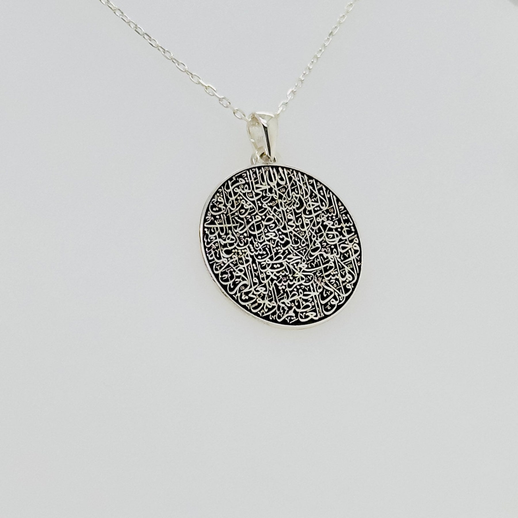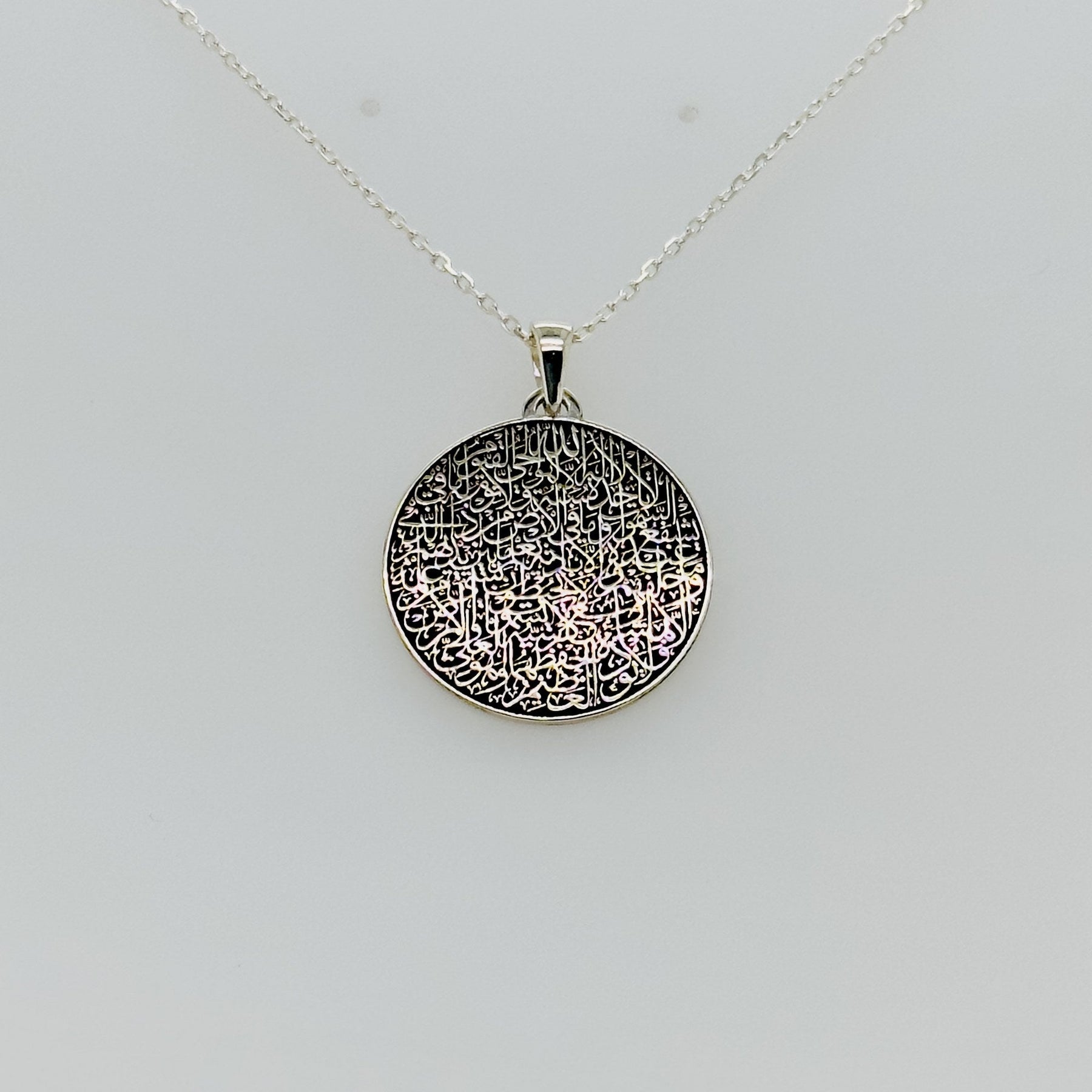 Jeder islamische Anhänger, fein gearbeitet auf hypoallergenem 925er Sterlingsilber, trägt den tiefgründigen Ayatul-Kursi-Vers und bietet seinem Träger Schutz und Frieden. Diese muslimische Halskette eignet sich perfekt als Ramadan-Geschenk oder als wertvolles islamisches Geschenk. Sie symbolisiert den ewigen Kreis des Glaubens und verbindet den Träger mit einer tiefen Linie islamischer Tradition. Sie ist ein exquisites Symbol der Hingabe und verbindet die Essenz muslimischen Schmucks nahtlos mit zeitloser Eleganz.