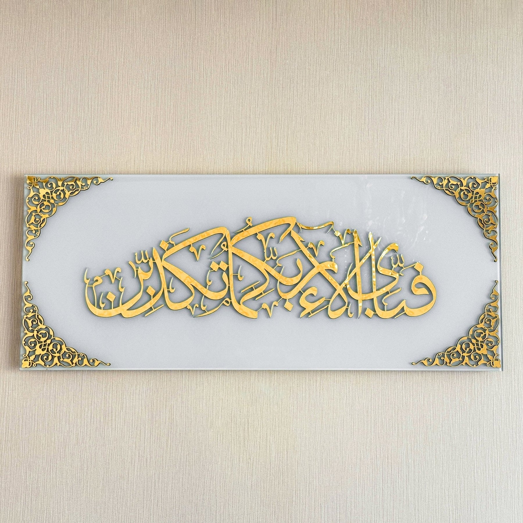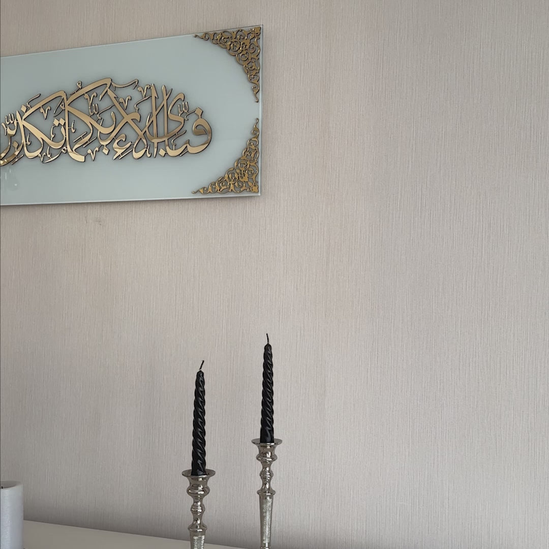 Erleben Sie die ruhige Schönheit unserer islamischen Wandkunst aus gehärtetem Glas mit Vers 13 der Surah Rahman, einem Stück, das die heitere Botschaft des Korans in Ihr Zuhause bringt.
