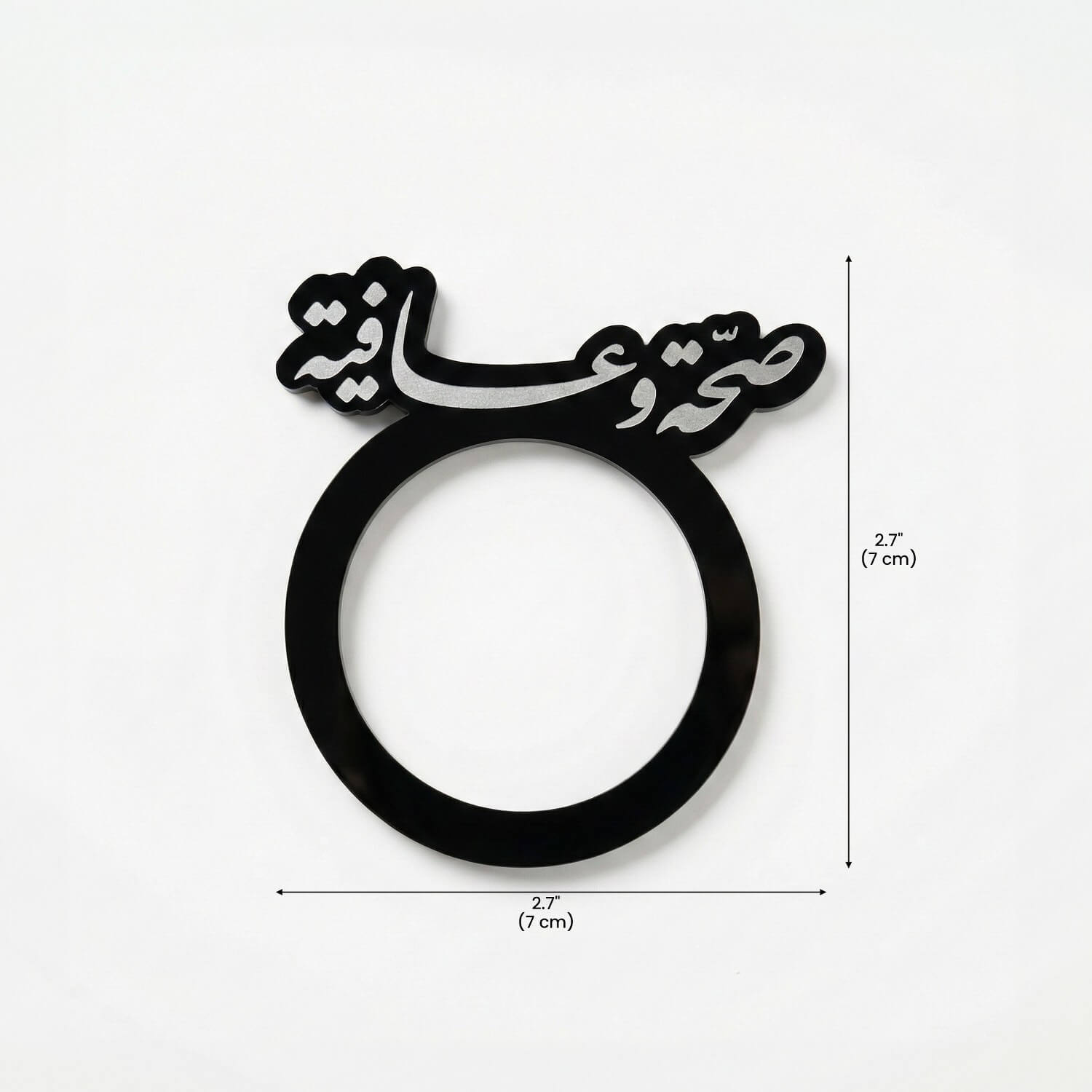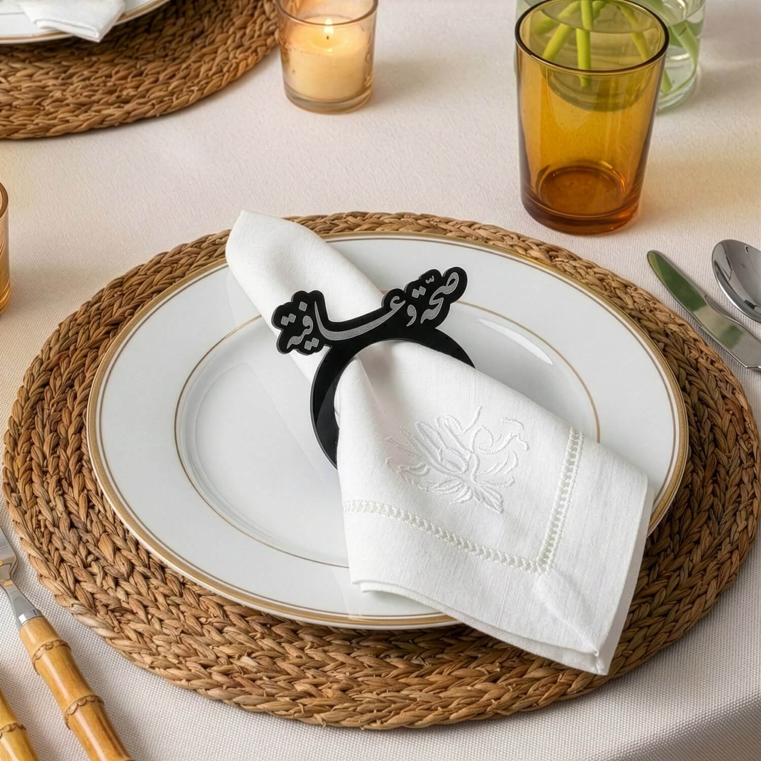 Complete your **iftar table** setting with our **Saha w Afia Acrylic Napkin Rings**. Precision-cut from high-quality **acrylic**, these elegant rings feature the traditional **arabic** greeting *"Saha w Afia"* (Health and Wellness), serving as a warm, modern welcome to your guests.