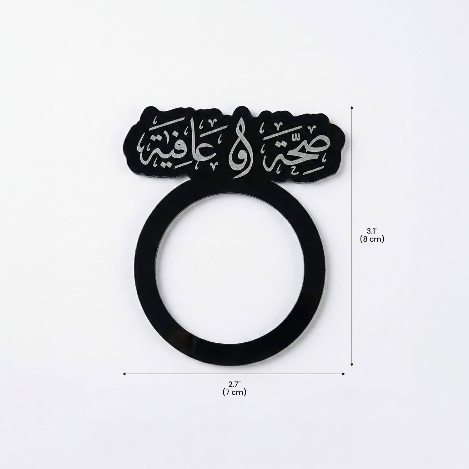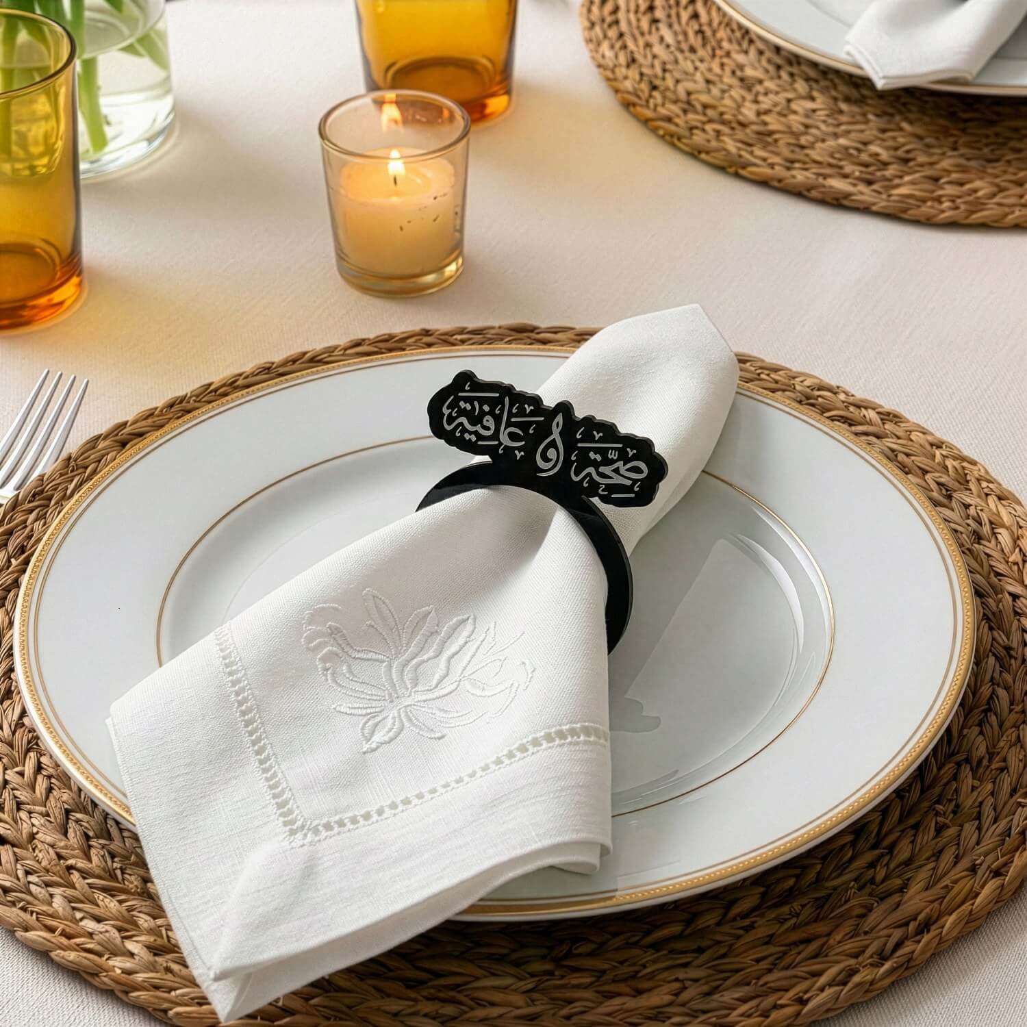 Elevate your **iftar table** with our **Saha w Afia Thuluth Acrylic Napkin Rings**. Featuring the traditional greeting *"Saha w Afia"* (Health and Wellness) written in the majestic **Thuluth script**, these rings bring a touch of classical Islamic art to your modern dining experience.