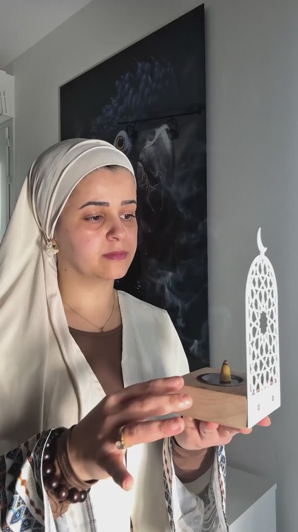 Dank seiner kompakten Form passt er perfekt auf kleinere Beistelltische, während die hohe Metallrückwand ihm eine moderne, architektonische Note verleiht und die Flamme oder Kohle wirksam vor Zugluft schützt. Er ist sicher, stilvoll und ideal zum Verbrennen von Bakhoor-, Oud- oder Harzräucherwerk.