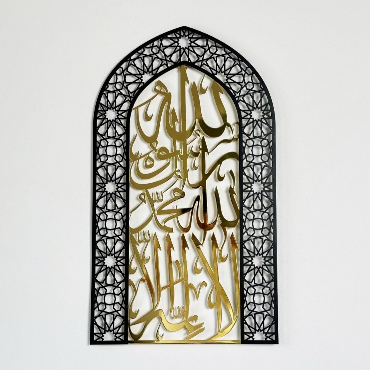 arabic-calligraphy-first-kalima-gold-metal-wall-art-tawheed-mihrab-dome-islamic-decor-islamicwallartstore