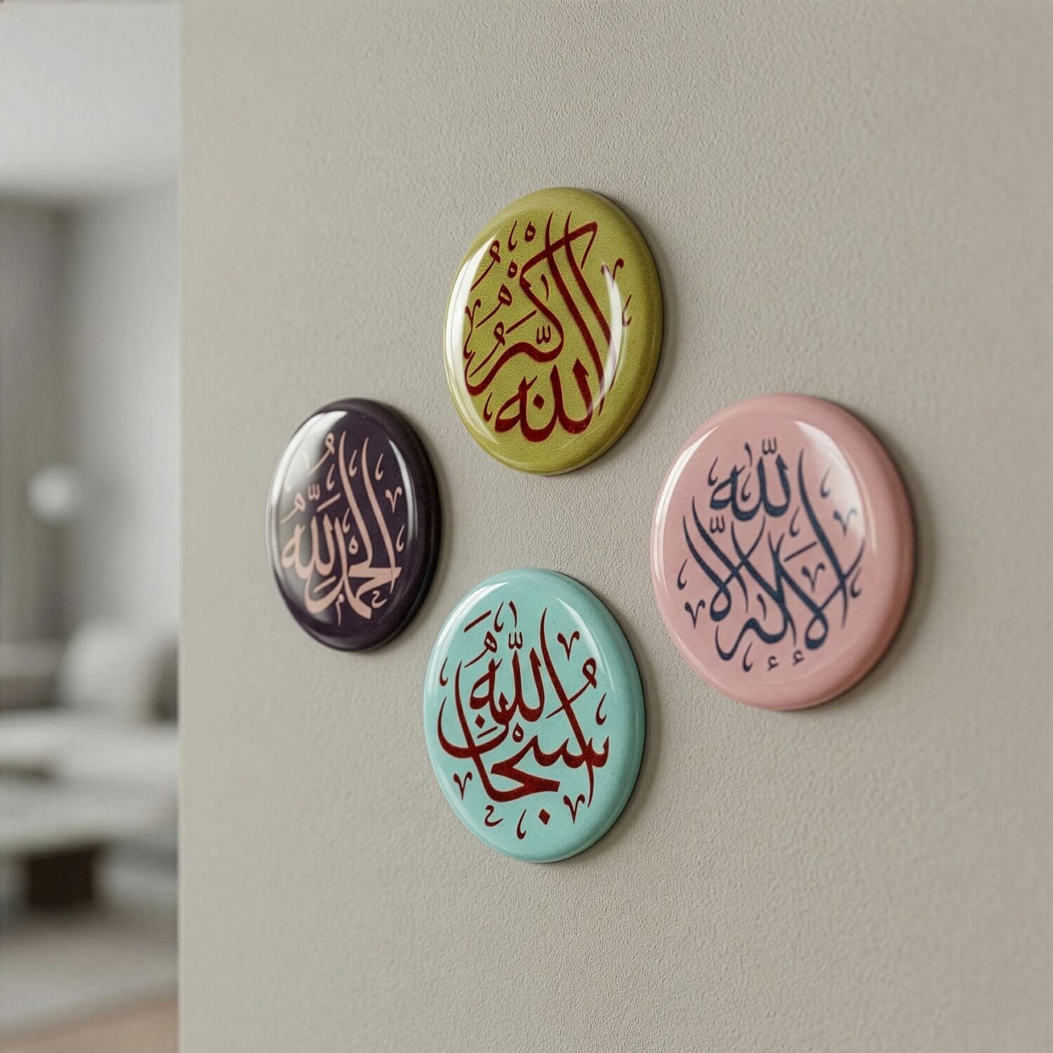 Four colorful buttons with Arabic calligraphy on a wall.