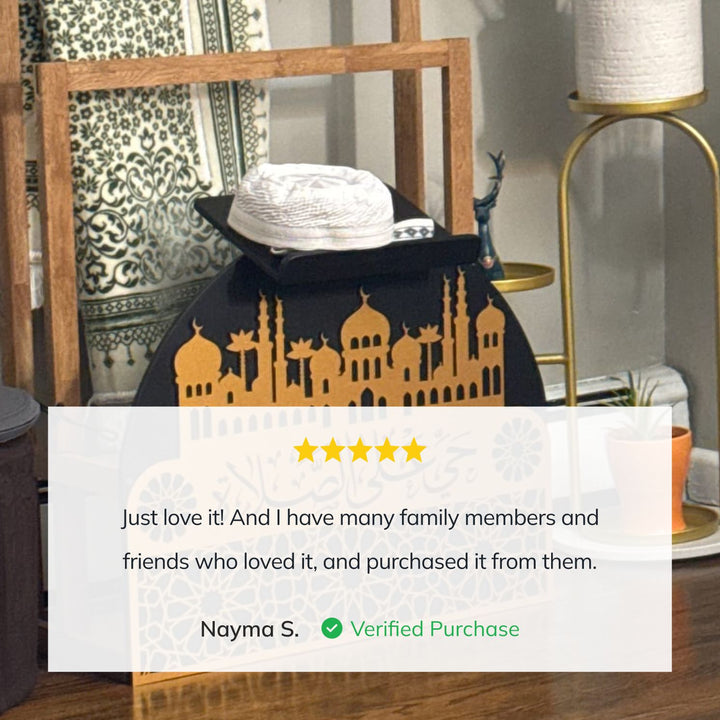 Doté de deux niveaux pour tapis de prière et d'un support spécial pour Coran, cet objet organise parfaitement vos essentiels de prière. Orné de silhouettes de mosquées et de la phrase arabe invitante « Hayya 'ala-s-Salah » sur le devant, il rappelle constamment l'appel à la prière. Cette solution élégante pour ranger vos tapis de prière permet non seulement de garder votre espace bien rangé, mais aussi de l'enrichir d'une atmosphère de tranquillité et de recueillement.