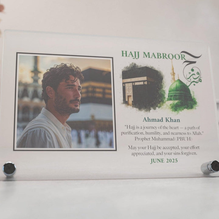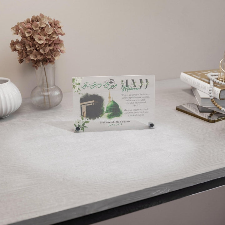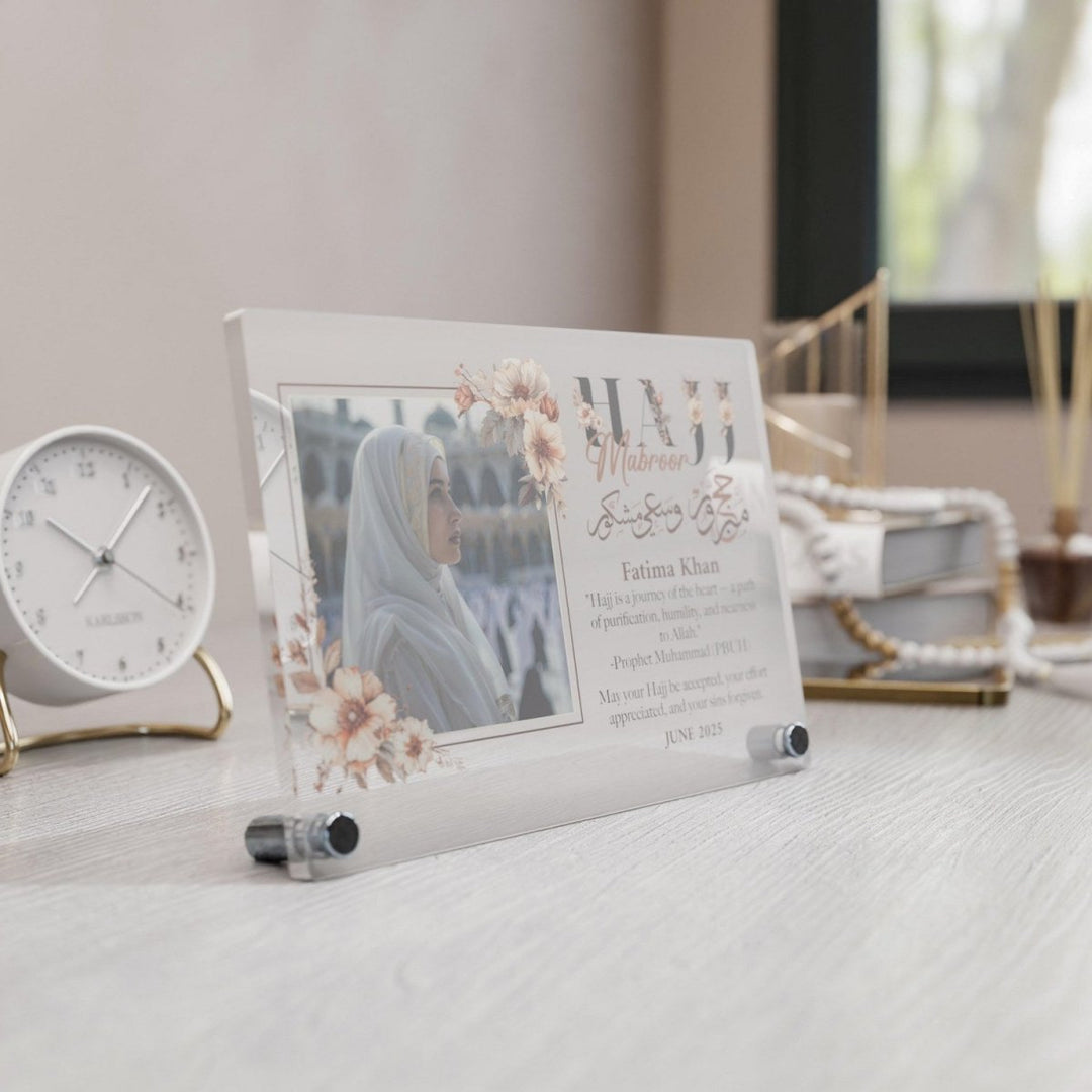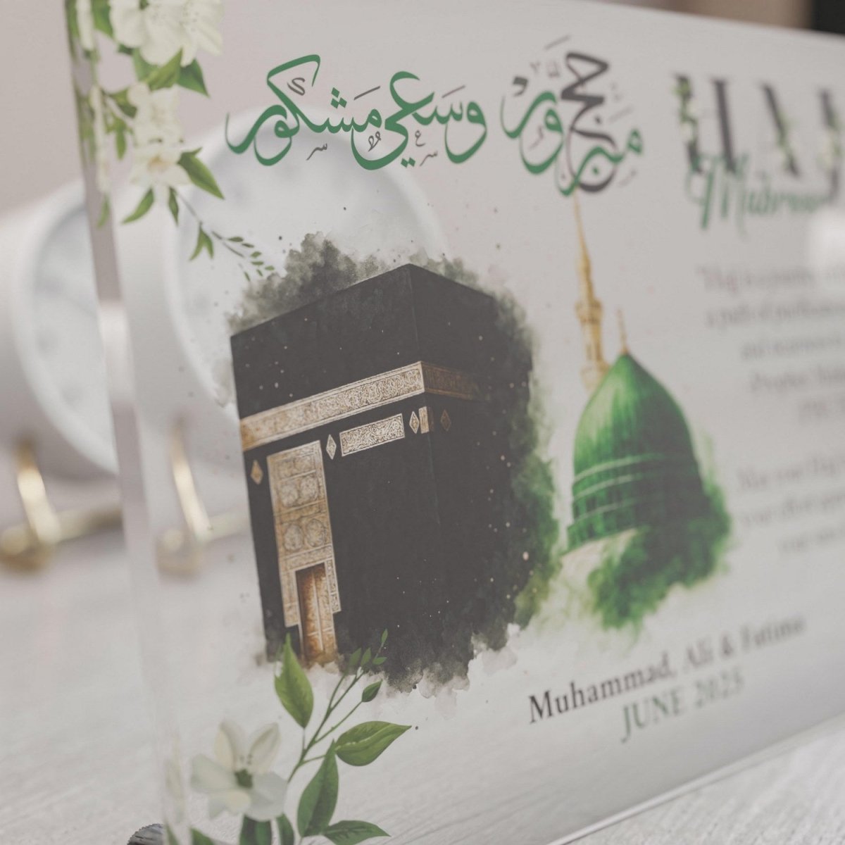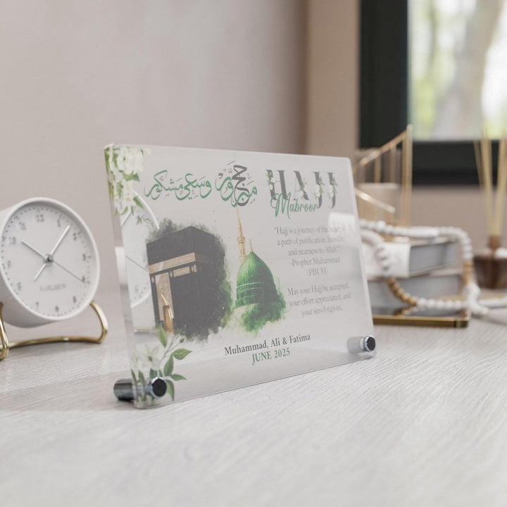 La décoration de table Mabroor personnalisable pour le Hajj est un chef-d'œuvre unique qui apporte l'essence spirituelle du Hajj à votre intérieur. Personnalisez cette décoration de table pleine de sens avec votre texte et votre photo, pour des souvenirs inoubliables du Hajj. Parfaite pour une décoration d'intérieur islamique, elle présente un design esthétique et élégant grâce à la technologie d'impression UV. Qu'elle soit un symbole de l'accomplissement du Hajj ou un rappel quotidien des jours du Hajj, cette pièce apporte une touche de profondeur à votre intérieur.