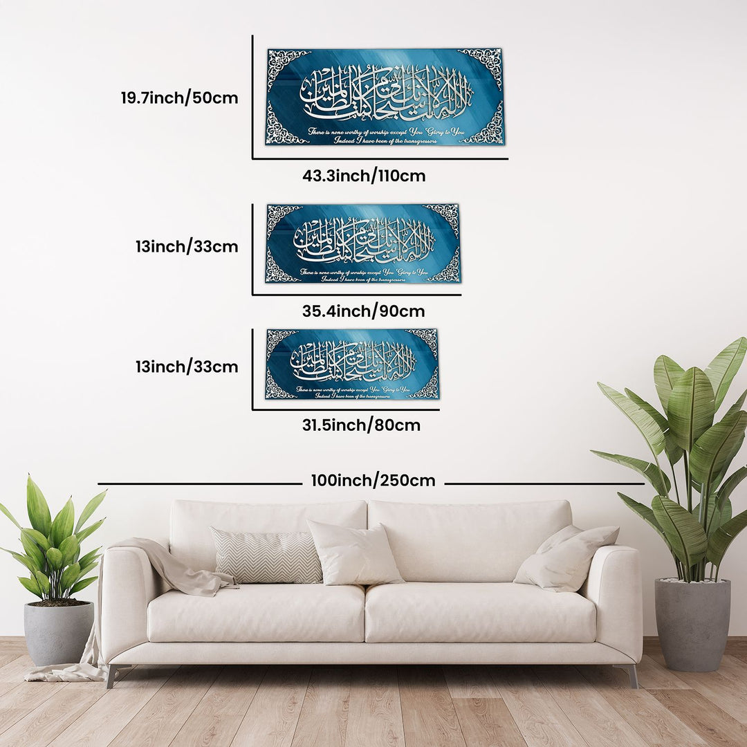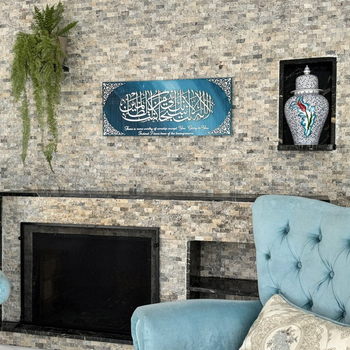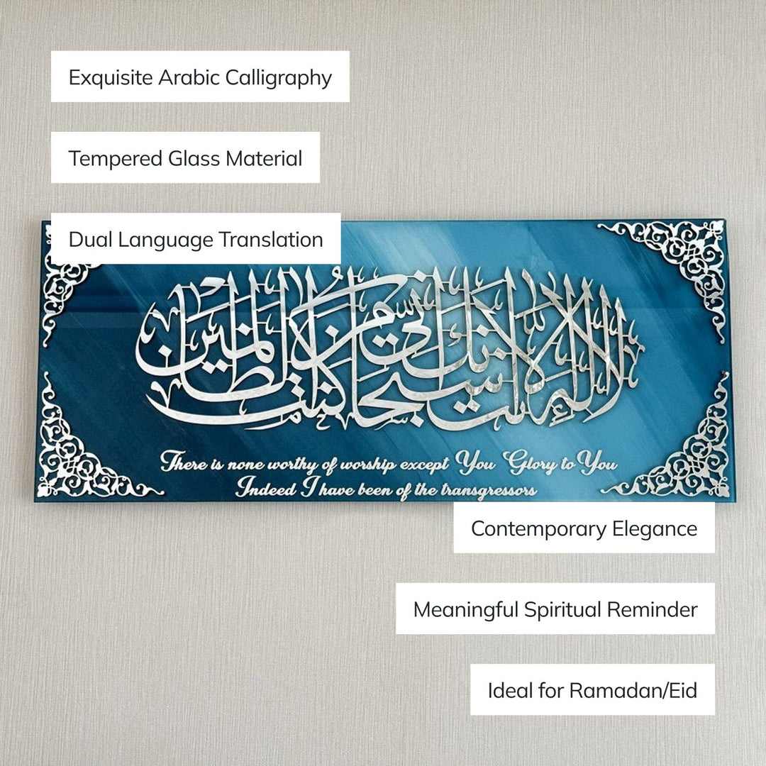 Beautify your home with the serene and powerful Dua of Prophet Yunus (Part of the 87th verse of Surah Anbiya), presented in exquisite Arabic calligraphy with English translation on tempered glass.