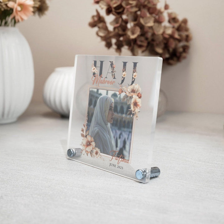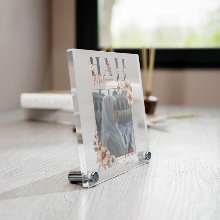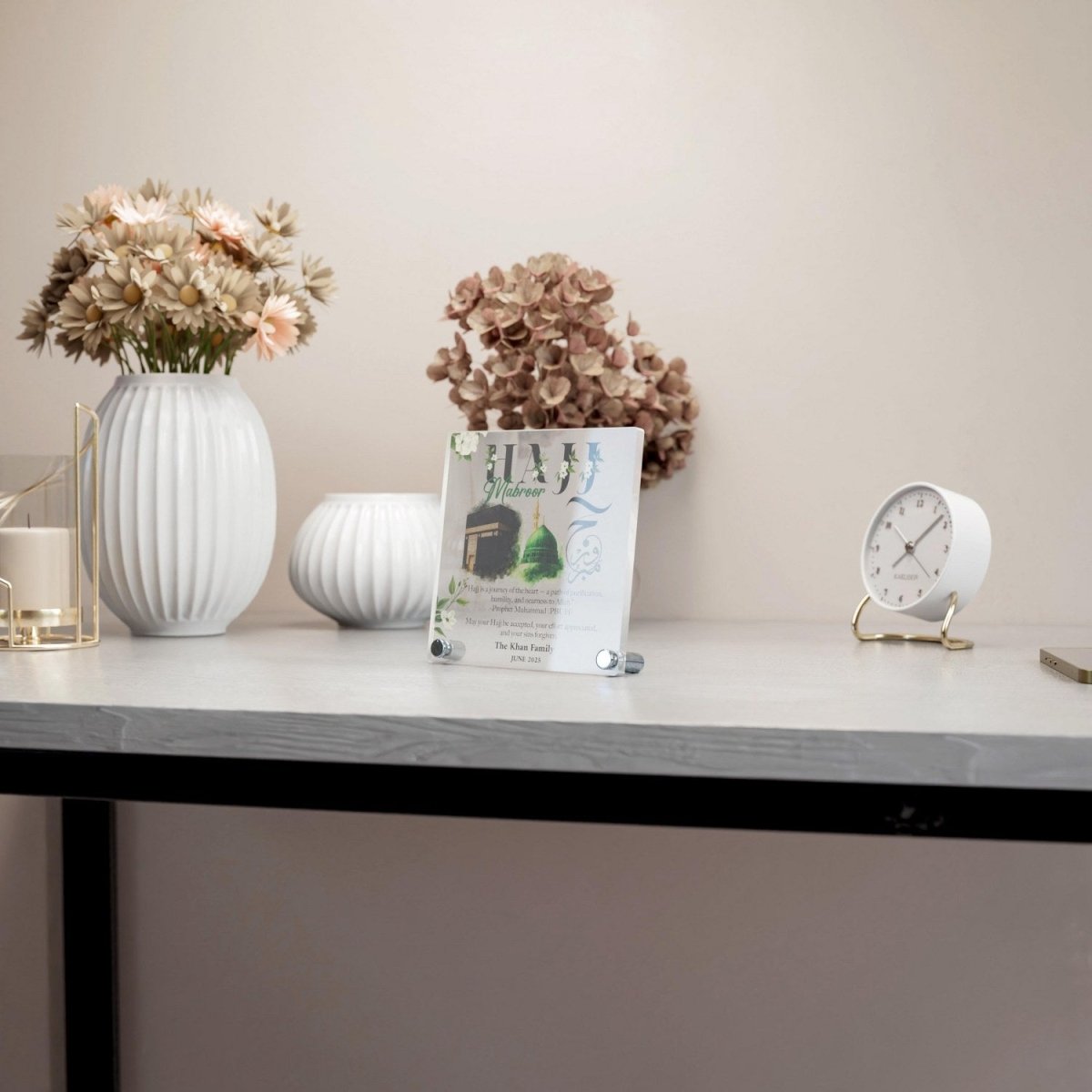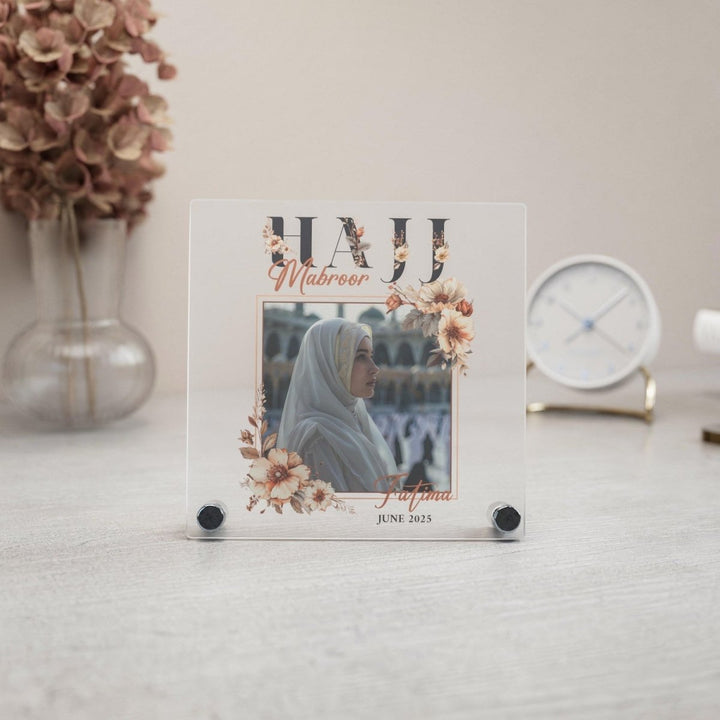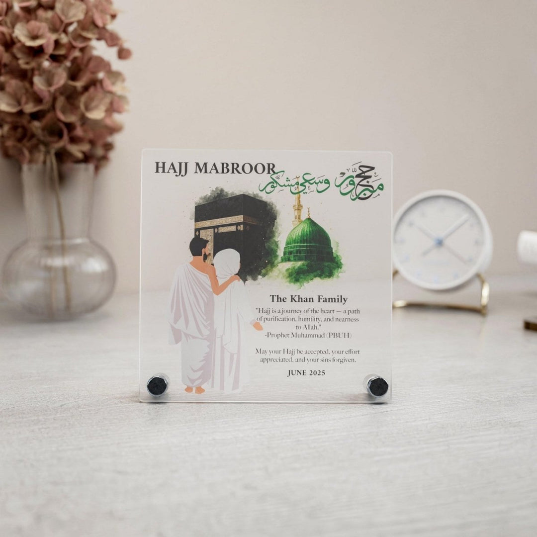 Hajj Mabroor Square Table Decor - This customizable piece allows you to add your personal text and photo, creating a heartfelt keepsake that honors your pilgrimage journey. Designed with elegant aesthetics and advanced UV printing, it perfectly complements any Islamic home decor. Whether as a meaningful reminder of your sacred Hajj days or a symbol of accomplishment, this square tabletop art enriches your space with faith and devotion.