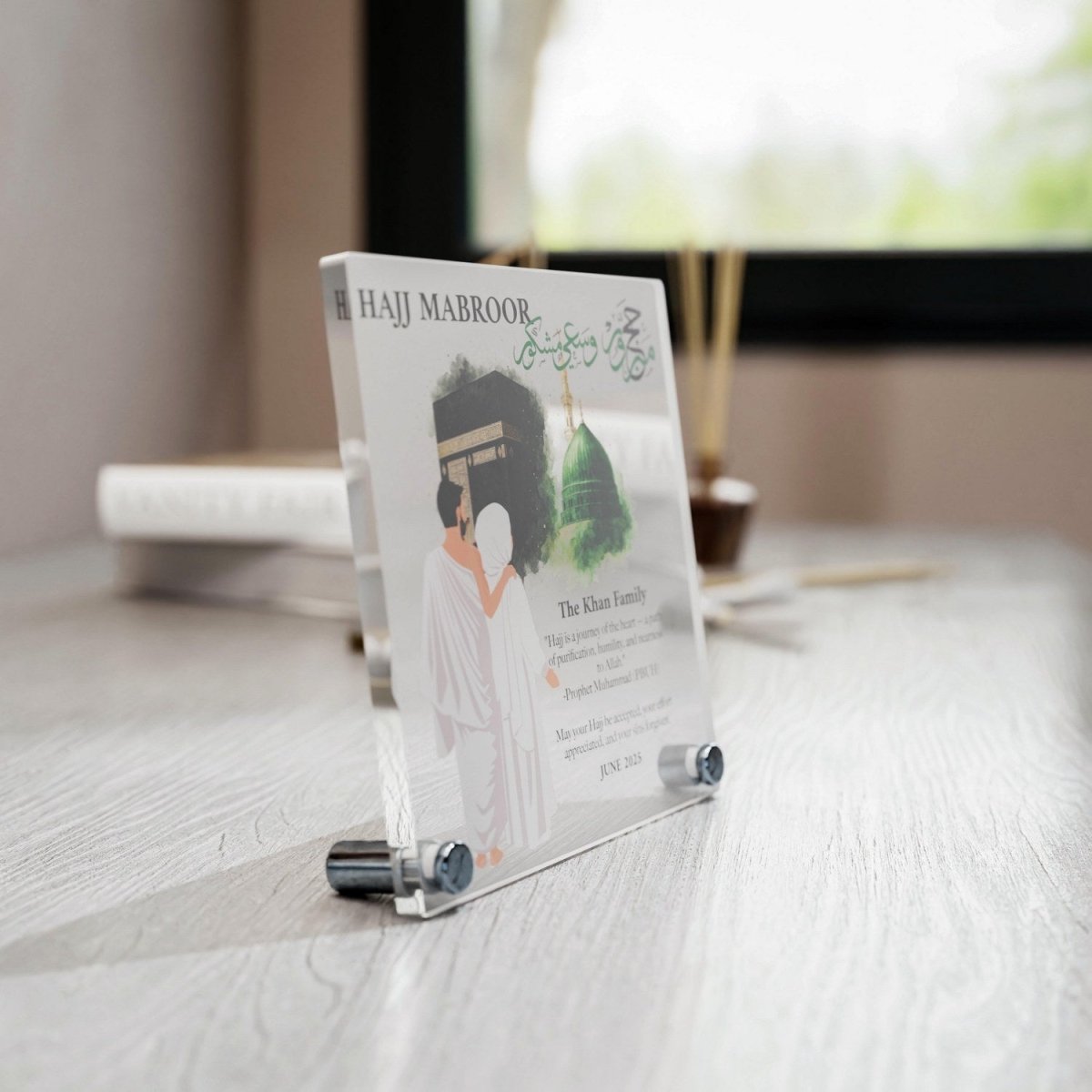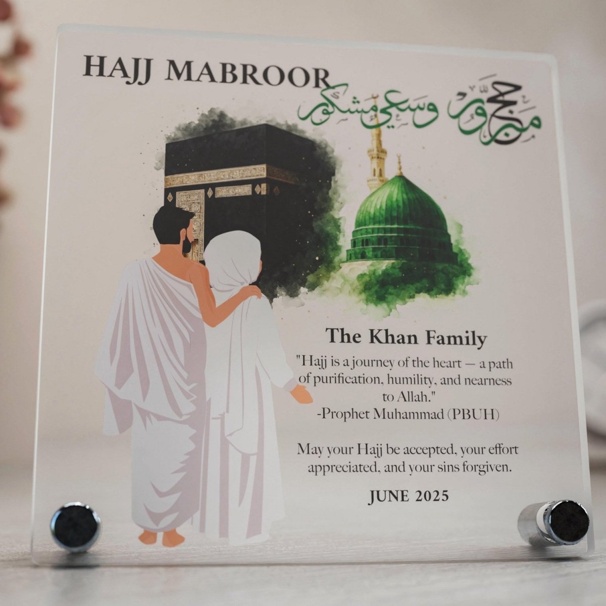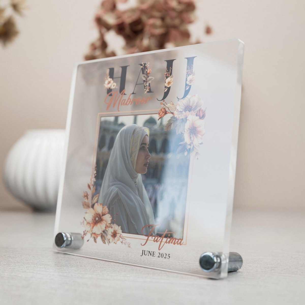 Hajj Mabroor Square Table Decor - This customizable piece allows you to add your personal text and photo, creating a heartfelt keepsake that honors your pilgrimage journey. Designed with elegant aesthetics and advanced UV printing, it perfectly complements any Islamic home decor. Whether as a meaningful reminder of your sacred Hajj days or a symbol of accomplishment, this square tabletop art enriches your space with faith and devotion.