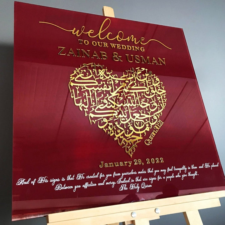 Perfectly crafted for Islamic weddings, this white, customizable glass welcome sign warmly greets your guests while reflecting the profound beauty of marital harmony described in Surah Rum Ayat 21. Ideal for modern wedding settings, our tempered glass sign adds sophistication and can be personalized to complement your unique wedding theme. Handcrafted with care, this sign serves as a stunning focal point, ensuring your wedding décor resonates with warmth and divine inspiration. Make your special day even more memorable with a sign that welcomes guests with style and grace, symbolizing the deep bonds of love and companionship.