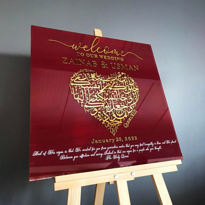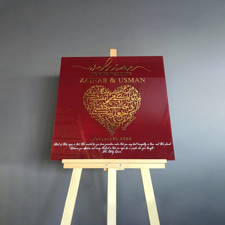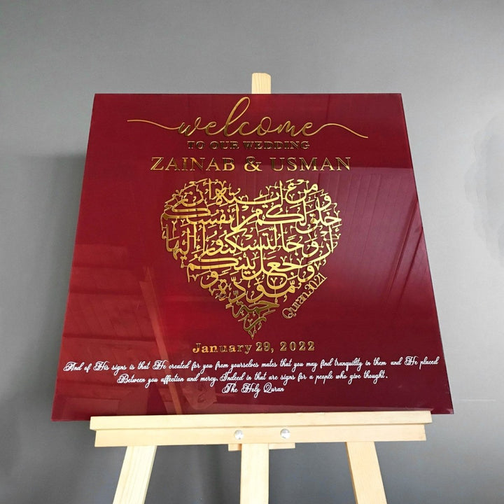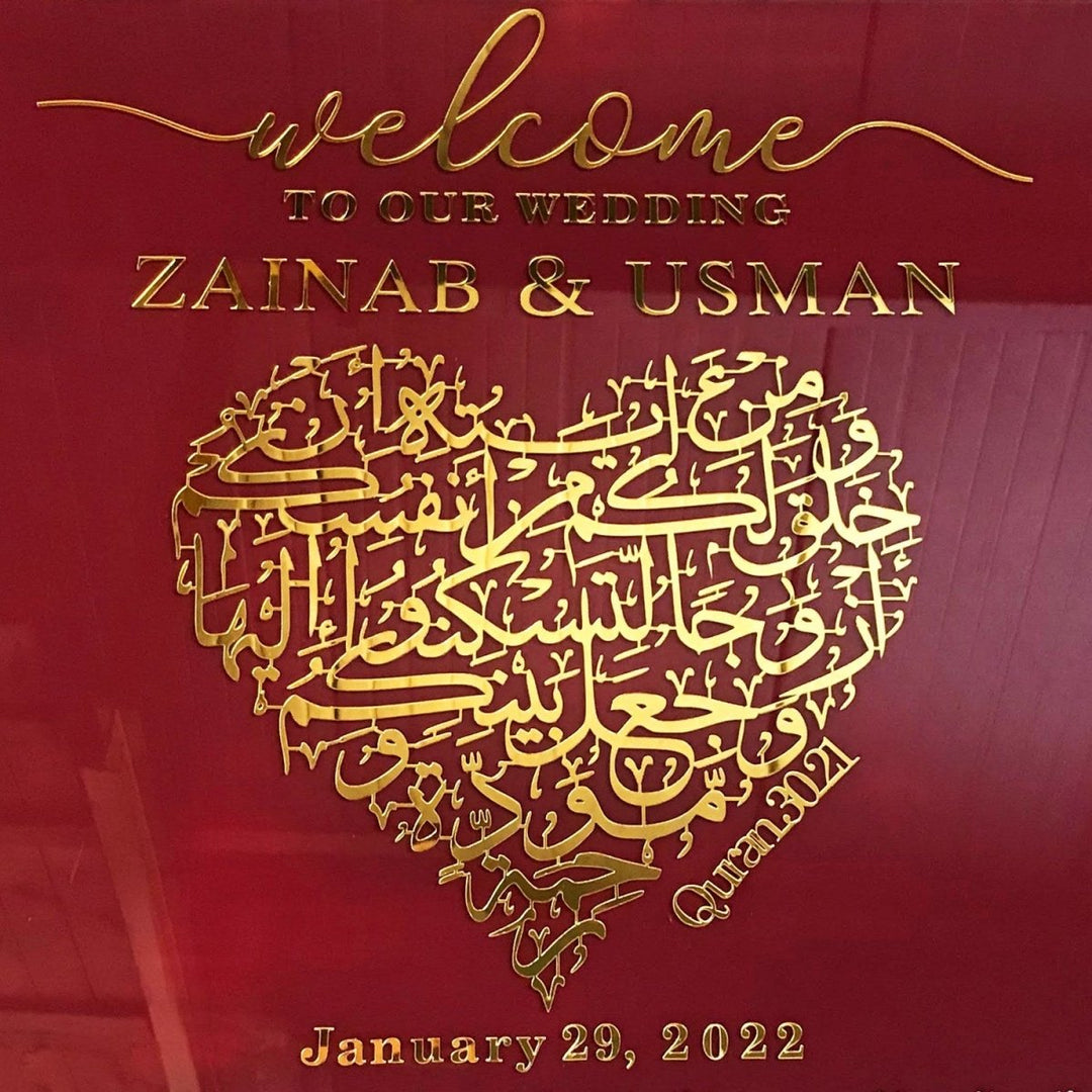 Welcome to your unforgettable wedding day with our "Nikkah Sign - Islamic Wedding Welcome Signage Surah Rum Ayat 21," a bespoke piece that blends spiritual significance with elegant design.