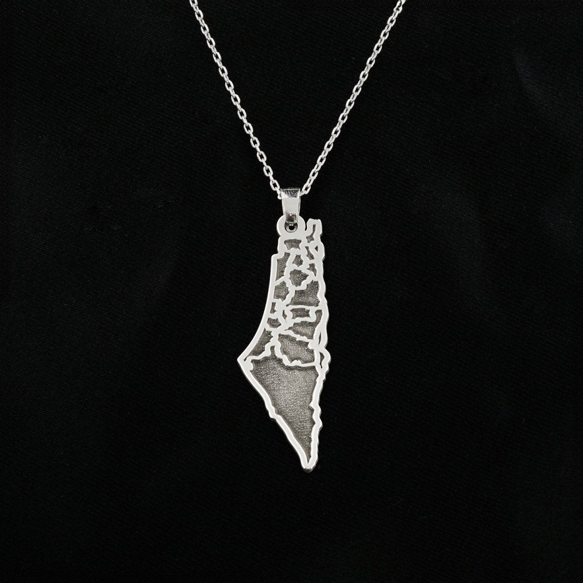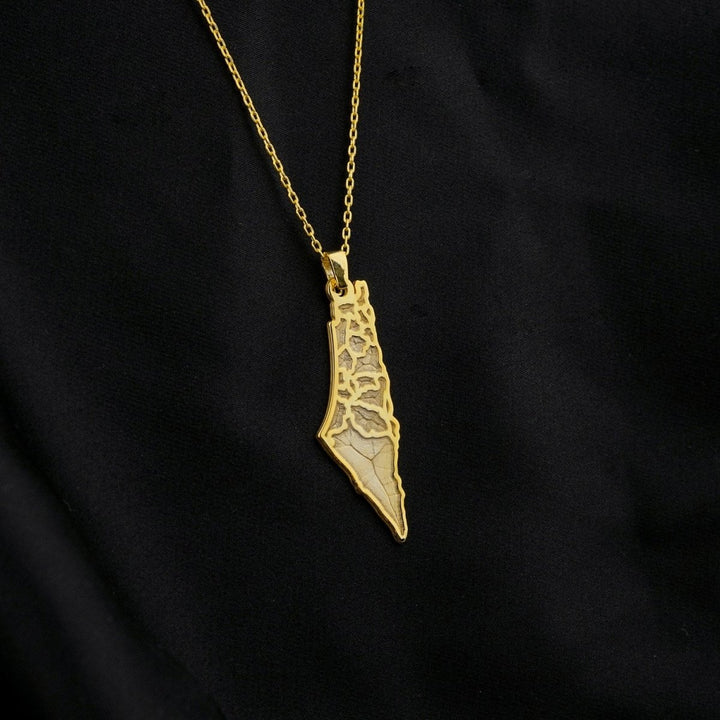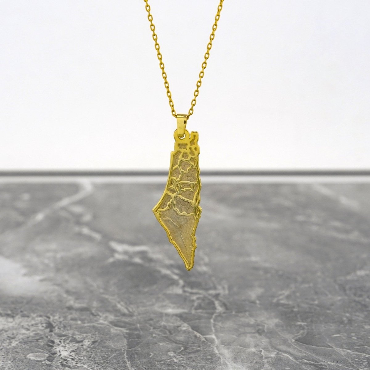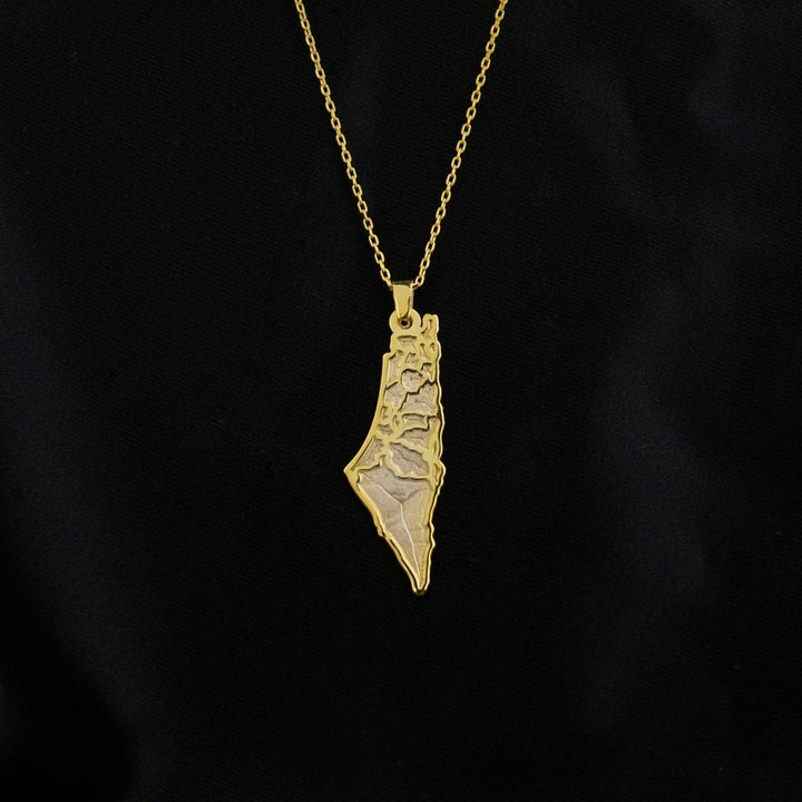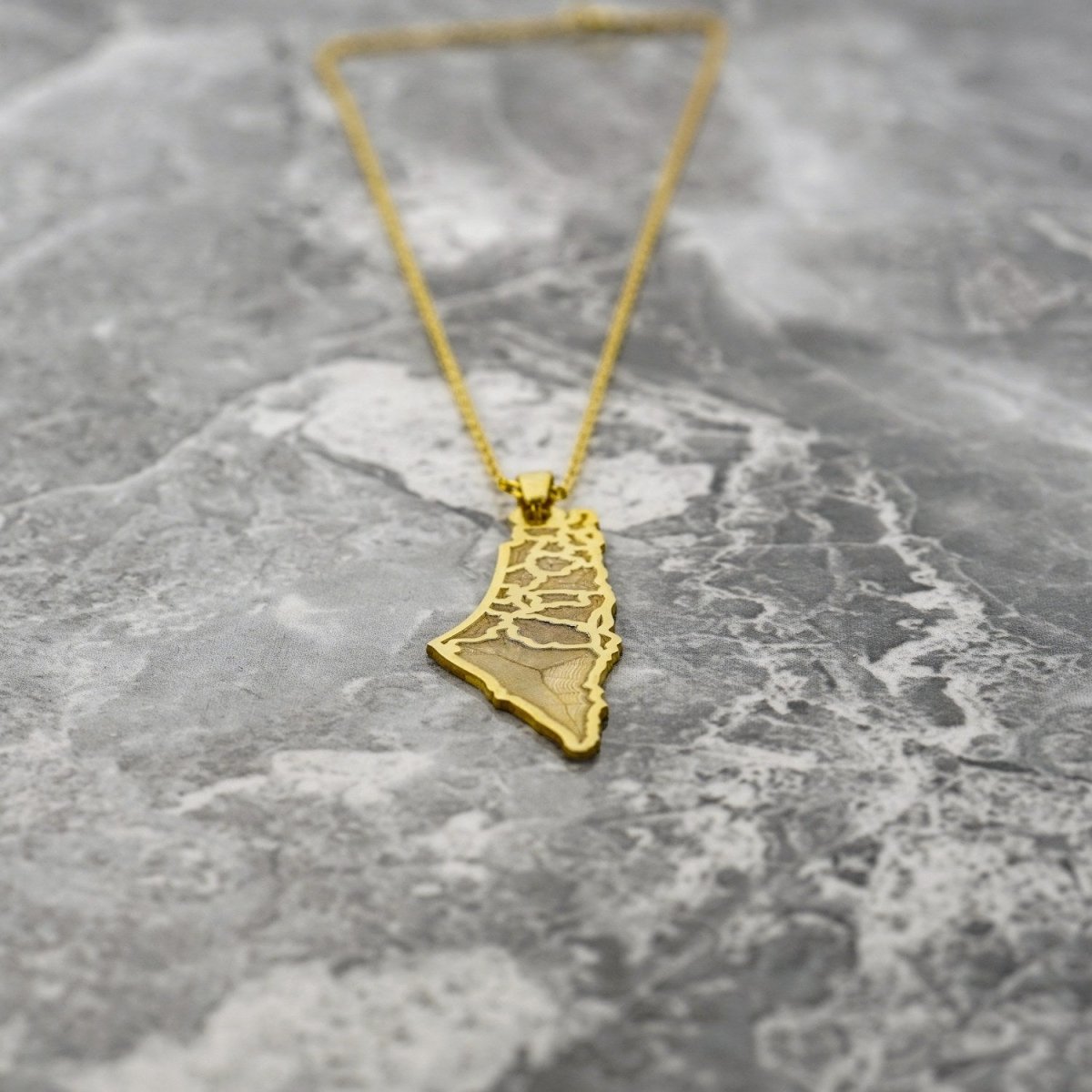 This beautiful Palestine gold necklace features an engraved map of Palestine, crafted with 18K gold-plated silver. The pendant's detailed design makes it both elegant and significant, allowing you to carry a piece of history wherever you go. This Palestine Map Necklace stands out as a perfect combination of tradition and style, making it a unique addition to any collection. Whether for personal wear or as a thoughtful gift, this necklace is sure to leave a lasting impression.